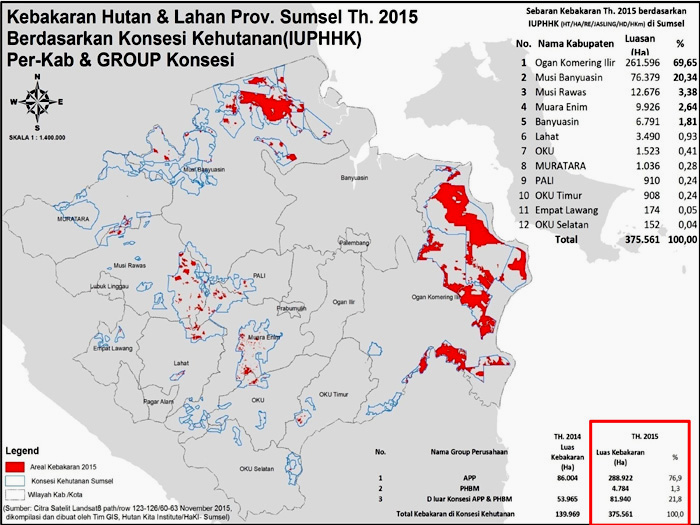 Pada kelompok Sinar Mas (PT. BMH, PT. BAP, PT. SBA, PT. KEN, TPJ, RHM, SHP dan BPP) kebakaran mencapai 77 persen atau sekitar 288,922 hektare dari total seluruh konsesi perusahaan kehutanan di Sumsel, yaitu 375,561 hektare. Kebakaran di konsesi tersebut seluas 174,080 hektare atau 60 persen adalah ekosistem gambut.