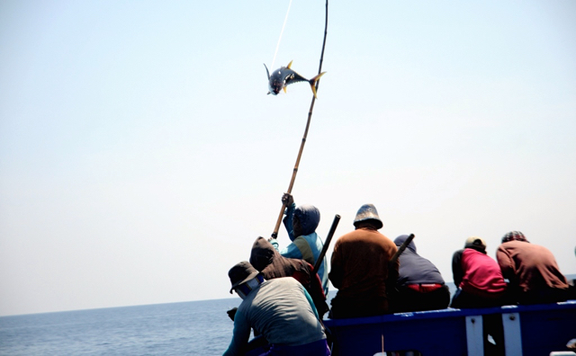 Di depan anjungan, terdengar suara mirip seseorang memukul kayu dengan palu. Cakalang (Katsuwonus pelamis) ukuran 3-4 kg berjatuhan. Para pemancing tak meninggalkan tempat duduk. Mereka menarik joran, mengangkat ikan, lalu terlepas sendiri.