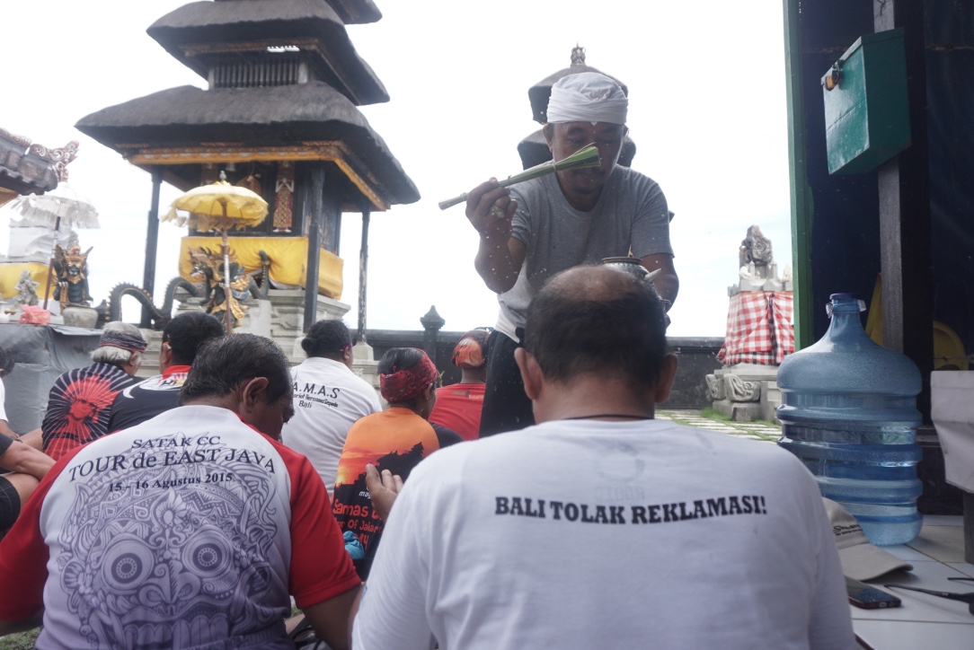 Sembahyang bersama di Pura Segara Taman Ayung, Padanggalak, Denpasar menutup perjalanan lima pesepeda anggota Sekretariat Bersama Sepeda (SAMAS) Bali. Sejak Jumat pagi, mereka naik sepeda berkeliling Pulau Bali untuk mengampanyekan gerakan Bali Tolak Reklamasi (BTR).