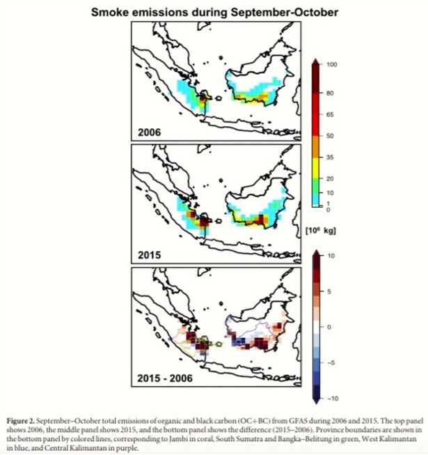Dari penelitian ini juga bisa terlihat, provinsi mana yang memberikan kontribusi pemasok asap ke berbagai wilayah itu. Sumatera Selatan menyumbang 62% atau 1,3 Tg, pada 2015, dibandingkan emisi 2006, Kalimantan Tengah 18% (0,4 Tg). Jambi, bertanggung jawab kurang 5% asap 2006, tetapi menyumbang emisi tertinggi ketiga pada 2015 atau 12% . Kontribusi asap Kalimantan Barat menurun dari 16% pada 2006 menjadi 6% pada 2015.