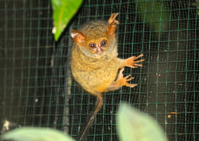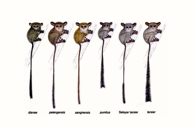 Tarsius, salah satu primata kecil di dunia. Binatang nokturnal alias aktif malam hari ini berukuran kecil, sebesar kepalan tangan. Ekor panjang dan berbulu. Primata ini memiliki empat kaki, lima jari. Pada ujung-ujung jari, berbentuk bulat– kemungkinan meredam suara saat melompat. Letak kuku juga unik, berdiri tegak dan agak meruncing.