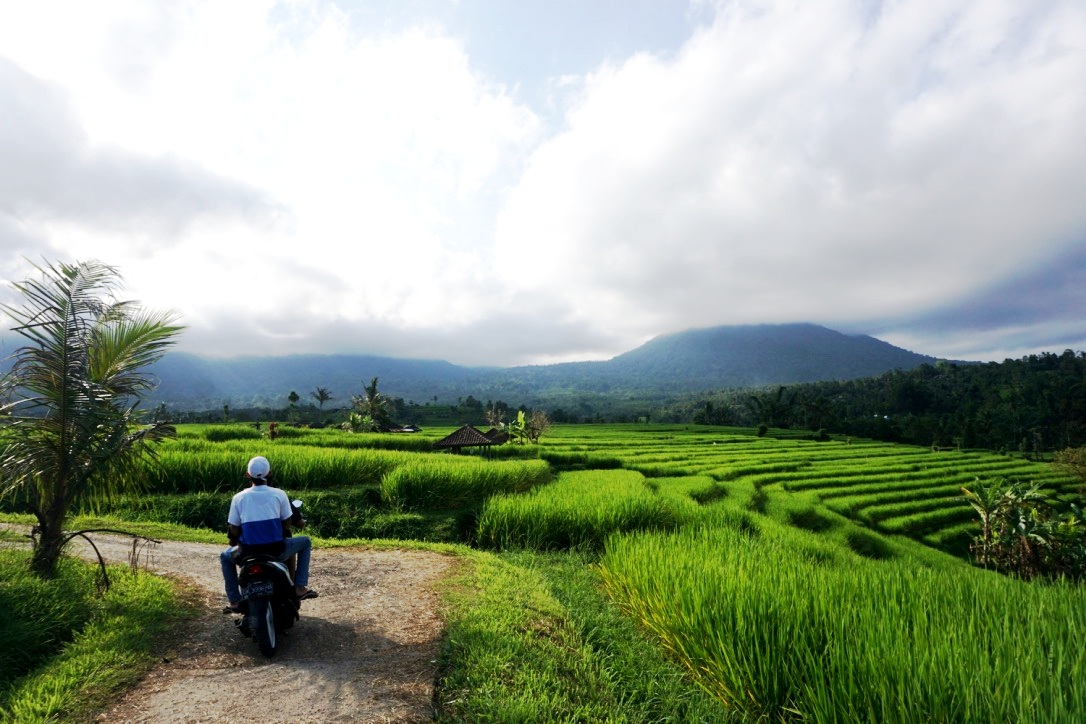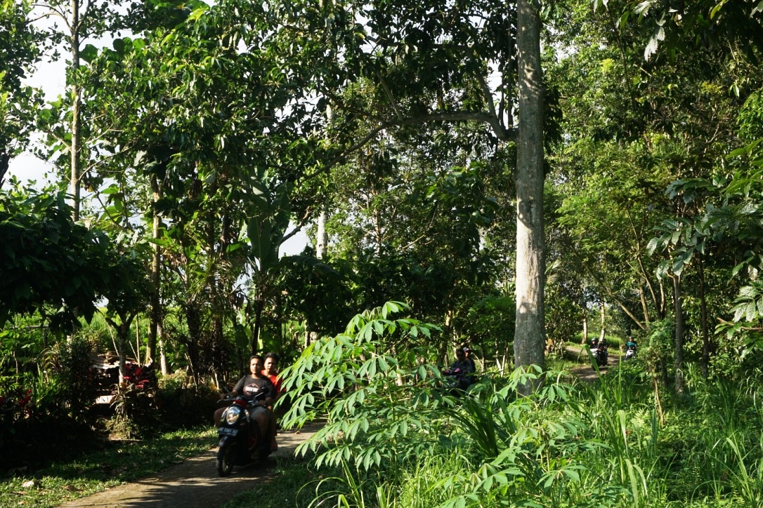 Jalan menurun dan berkelok kemudian menanjak menuju perbukitan. Terasering atau persawahan berundak sudah terlihat jelas dari jalan raya. Bebukitan sangat hijau dengan lebatnya pohon-pohon besar penyimpan air tanah.
