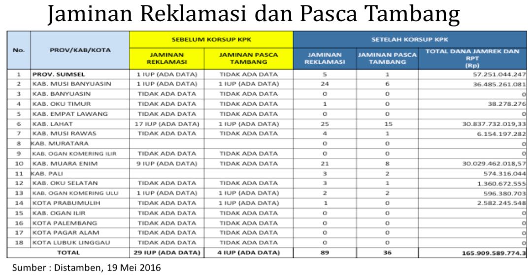 Menurutnya, total dana jaminan reklamasi yang terkumpul baru dari 125 perusahaan, yaitu sebesar Rp165.909.589.774. Sementara luas lahan yang akan direklamasi sekitar 1.075.364 hektar yang dikelola 173 perusahaan.