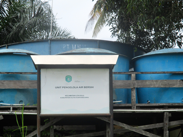 Tangki-tangki itu sumbangan PT MHU pada 2009. Ia menampung air sedotan dari kolam berukuran sekitar satu lapangan sepak bola, berjarak sekitar 500 meter dari situ. Terletak di Desa Margahayu, Loa Kulu, Kutai Kartanegara, Kaltim. Kolam itu milik PT MHU, bekas lubang tambang tak teruruk.