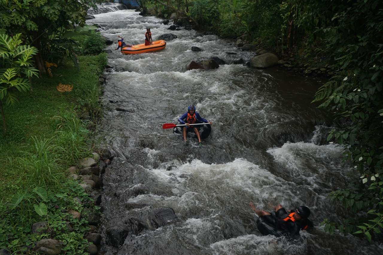 Menikmati sungai dan teriakan senang para penunggang arus yang semangat tiba di garis finish. Perahu karet terbalik menumpahkan penumpangnya menjadi pemandangan rutin. Suara riuh teriakan histeris dan senang memecah kesunyian.