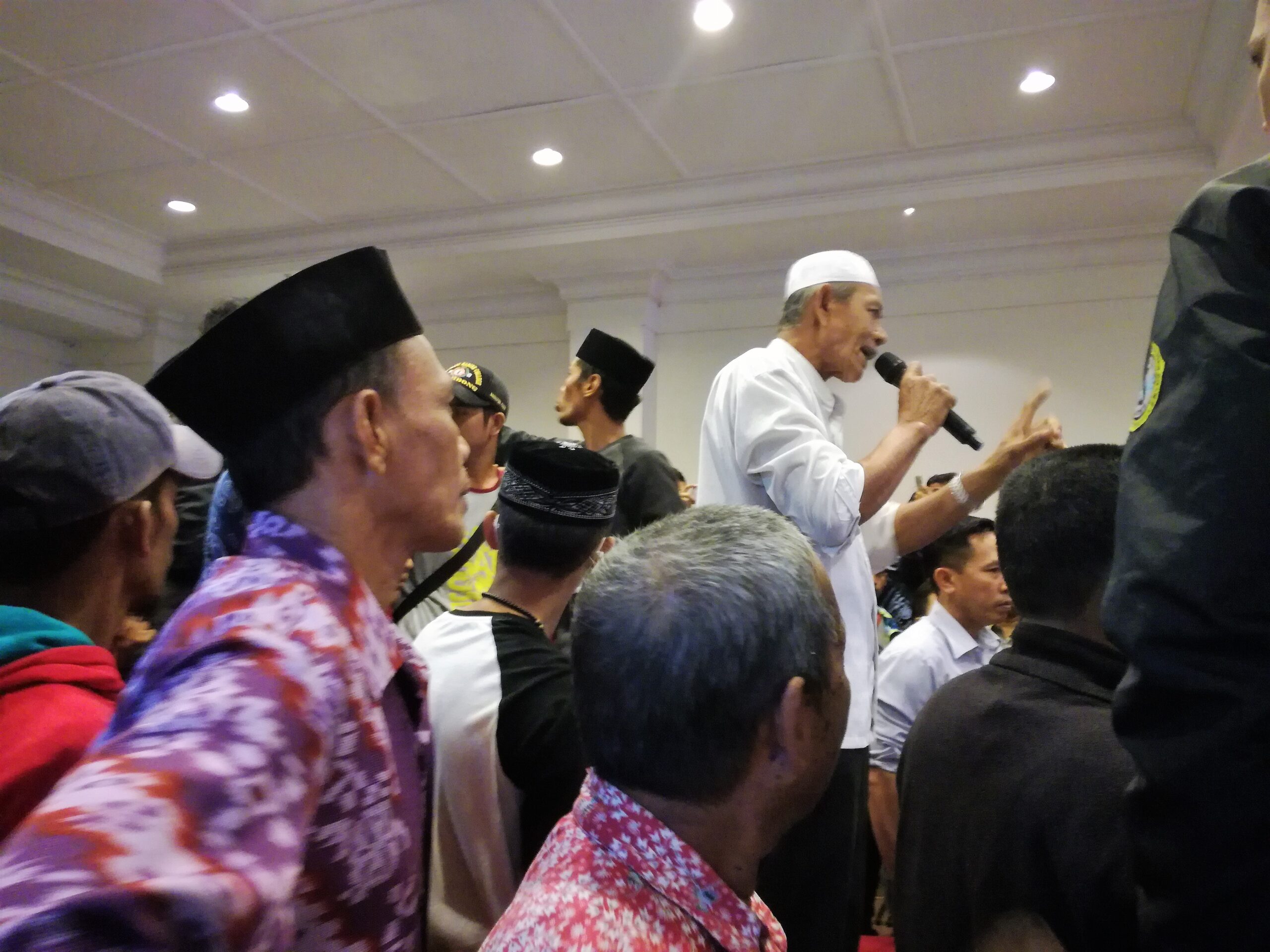 “Tak ada pejabat di ruangan ini boleh pergi sebelum memberi pernyataan akan menolak tambang pasir,” katanya, yang segera disambut warga lain dengan teriakan, “Betull!”