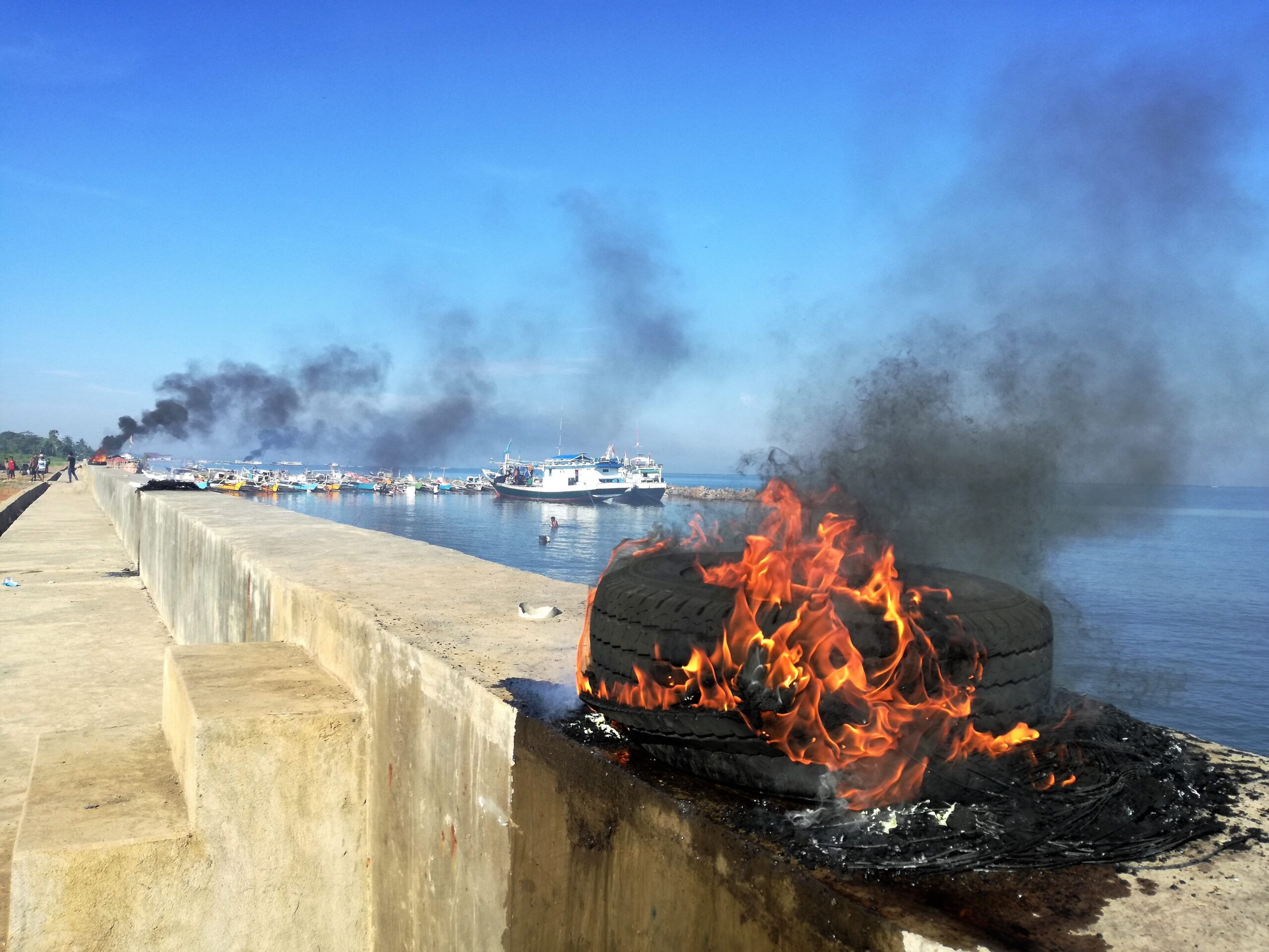 Minggu pagi, (2/7/2017), ada pemandangan tak biasa di sepanjang pantai Galesong Utara, Kabupaten Takalar, Sulawesi Selatan. Asap hitam mengepul memenuhi udara. Di beberapa lokasi terlihat ban mobil yang terbakar mengeluarkan bau yang menyegat.