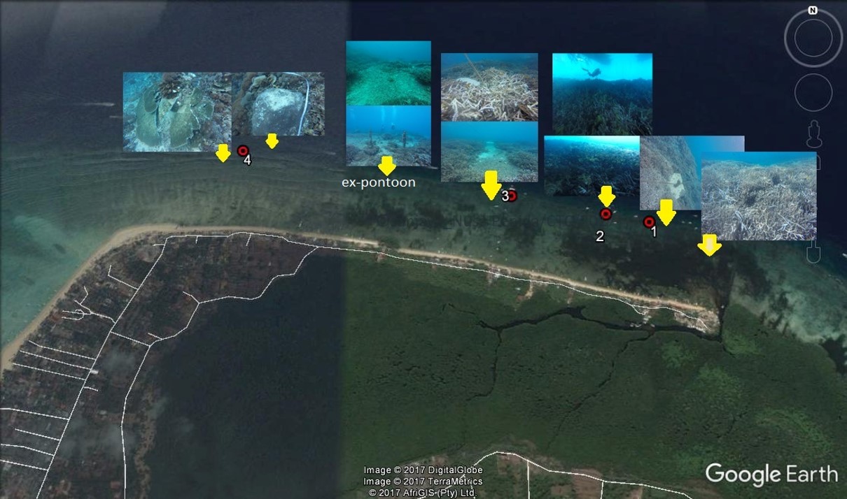 Panjang area pengamatan adalah sejauh 1.036 meter dengan berenang mengikuti arus. Hasilnya di lokasi pemantauan pertama adalah lokasi ponton yang sama dnegan temuan awal. Tali kapal diikatkan di karang, dan beton pemberat tertarik arus dan menyebabkan karang rusak.