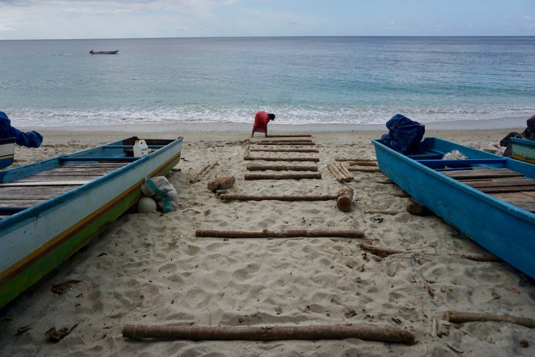 Sekelompok nelayan, antara 5-6 orang, menyambut teman-temannya yang baru sampai di pantai. Mereka menyiapkan balok-balok kayu di pasir sebagai pijakan ketika perahu kecil tiba di daratan, untuk memudahkan perahu bersandar.