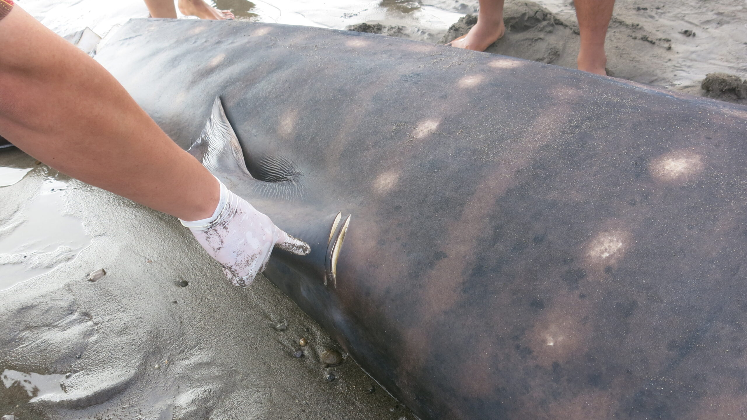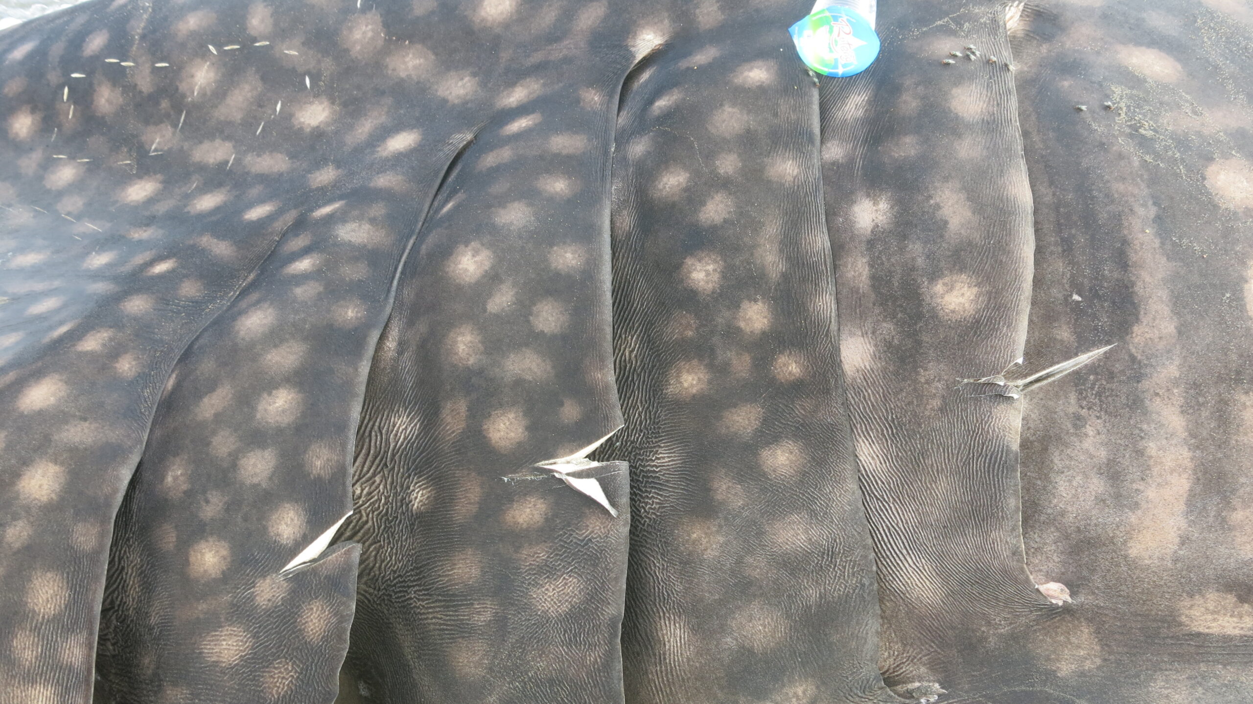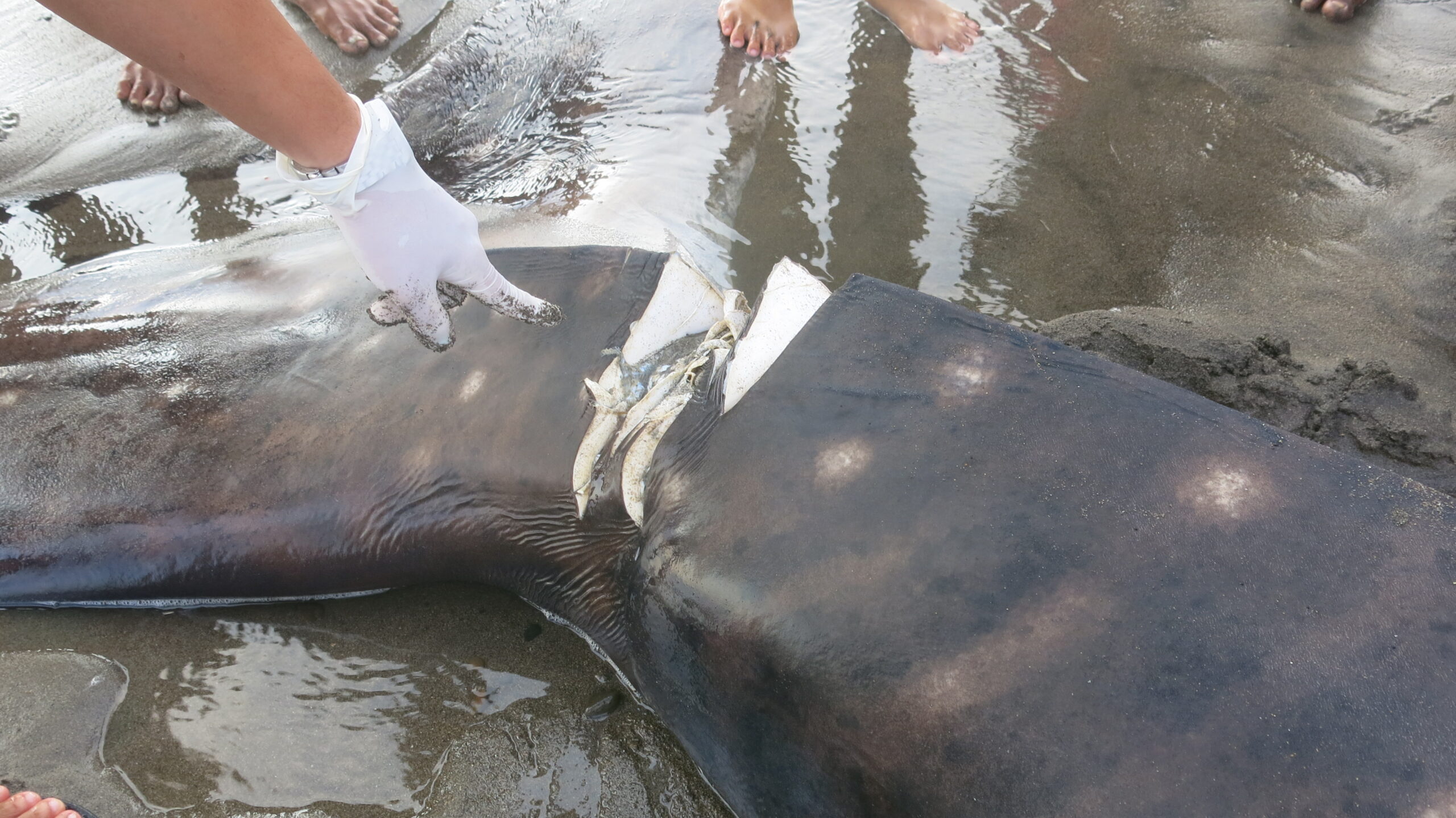 Daging antara sirip punggung dan ekor juga dipotong dan ada luka sayatan pada sirip punggung. Daging mulai membusuk saat dicatat.