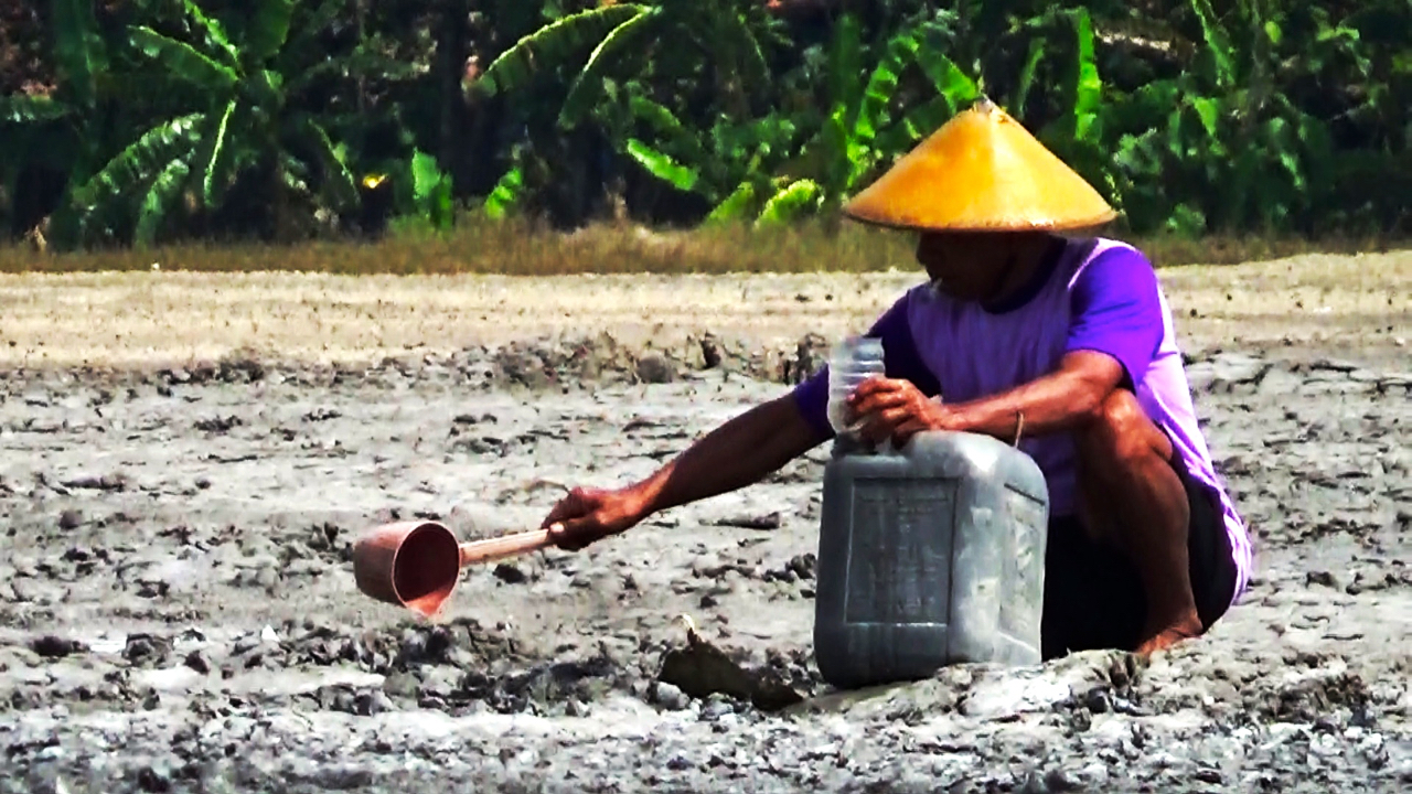 Agar sampai ke bak penampungan, petani lebih dulu membuat parit yang menghubungkan sumber air garam di sekitar lumpur. Bukan pekerjaan mudah membuatnya. Petani harus merangkak di lumpur untuk membuat jalur air.