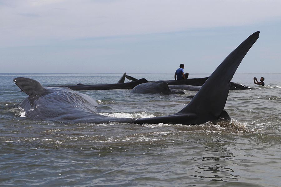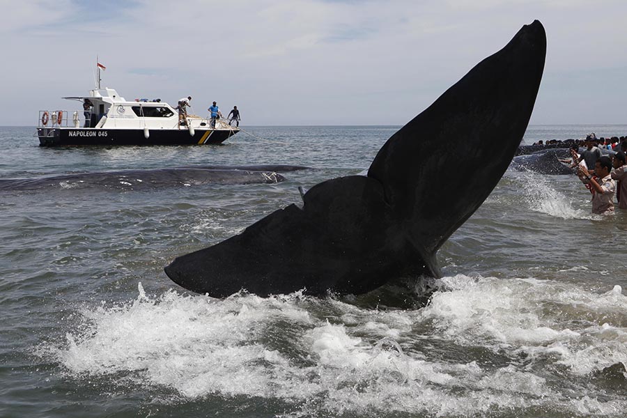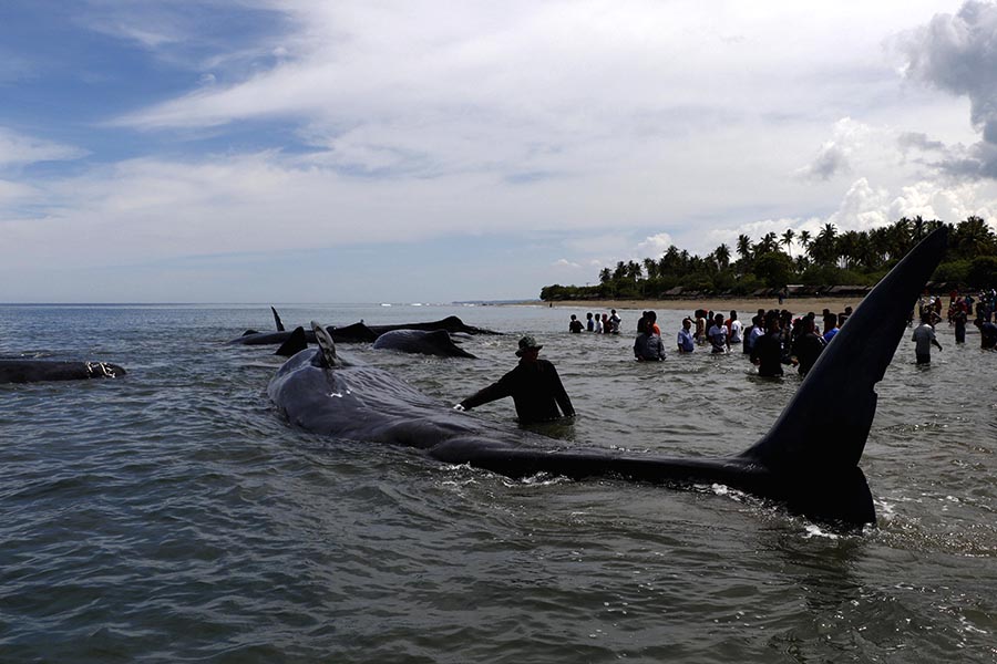 Sembilan paus sperma (Physeter macrocephalus) atau yang dikenal dengan sebutan paus kotak, terdampar di pantai Ujong Kareng, Kecamatan Mesjid Raya, Kabupaten Aceh Besar, Provinsi Aceh, Senin (13/11/17). Pemerintah bersama LSM lingkungan berupaya maksimal mengevakuasi seluruh mamalia tersebut untuk kembali ke laut, meski dalam perkembangannya tidak semua paus terselamatkan.