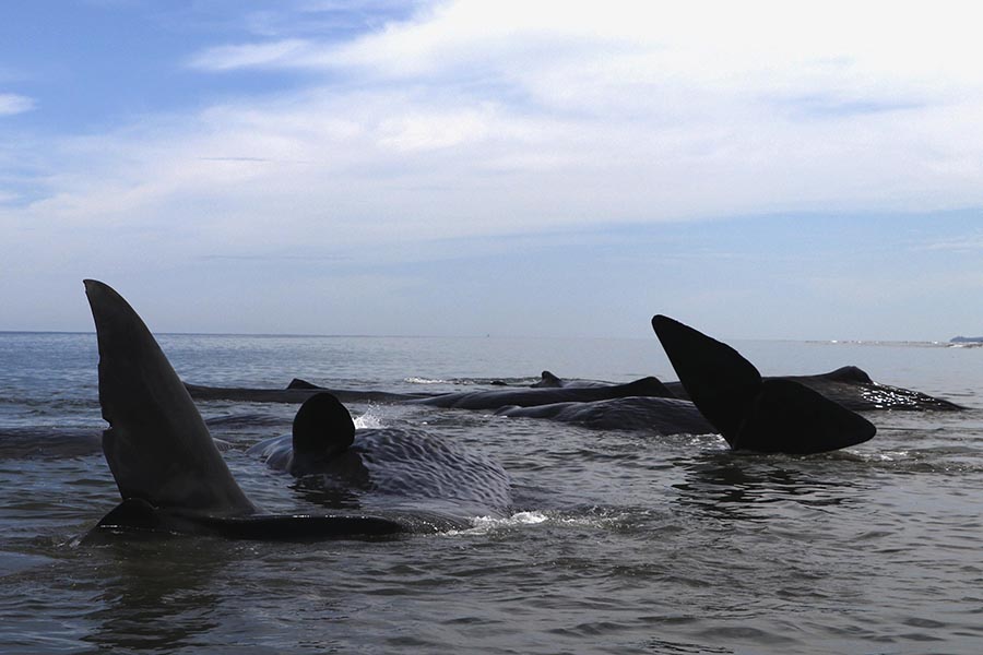 Muammar, warga Mesjid Raya, Kabupaten Aceh Besar menyatakan, awalnya masyarakat melihat dua paus terdampar. Namun, tidak lama berselang, muncul tujuh individu lagi. Melihat jumlah paus yang terdampar banyak, warga segera melaporkan kejadian tersebut kepada Panglima Laot dan Kepolisian.