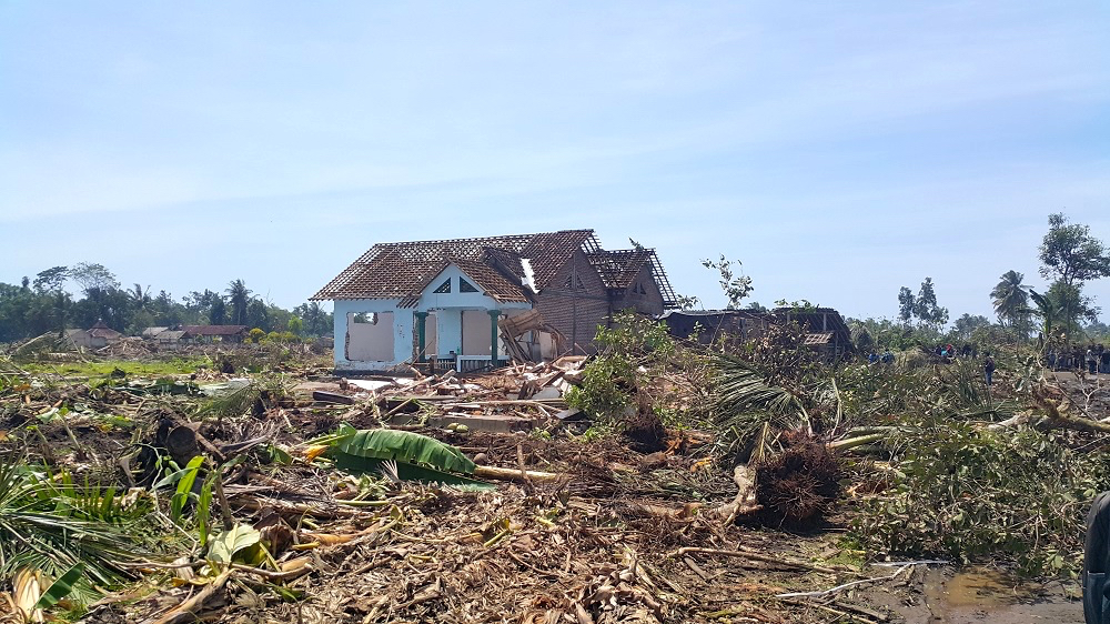 Agus sempat berkeliling halaman rumah. Dia melihat, pepohonan roboh. Sapi dalam kandang, tepat di kanan belakang rumah, masih aman. Akses jalan di depan rumahnya terkeruk backhoe.