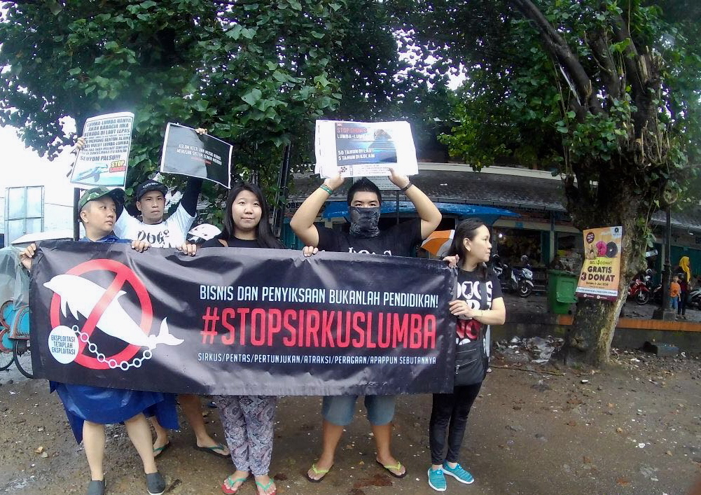 “Stop Sirkus Lumba-lumba.” “Bisnis dan Penyiksaan Bukanlah Pendidikan.” Begitu antara lain bunyi spanduk hitam yang dibentang koalisi pecinta satwa dari Jakarta Animal Aid Network (JAAN), Animal Friends Jogja (AFJ) dan Koalisi Peduli Satwa Solo.