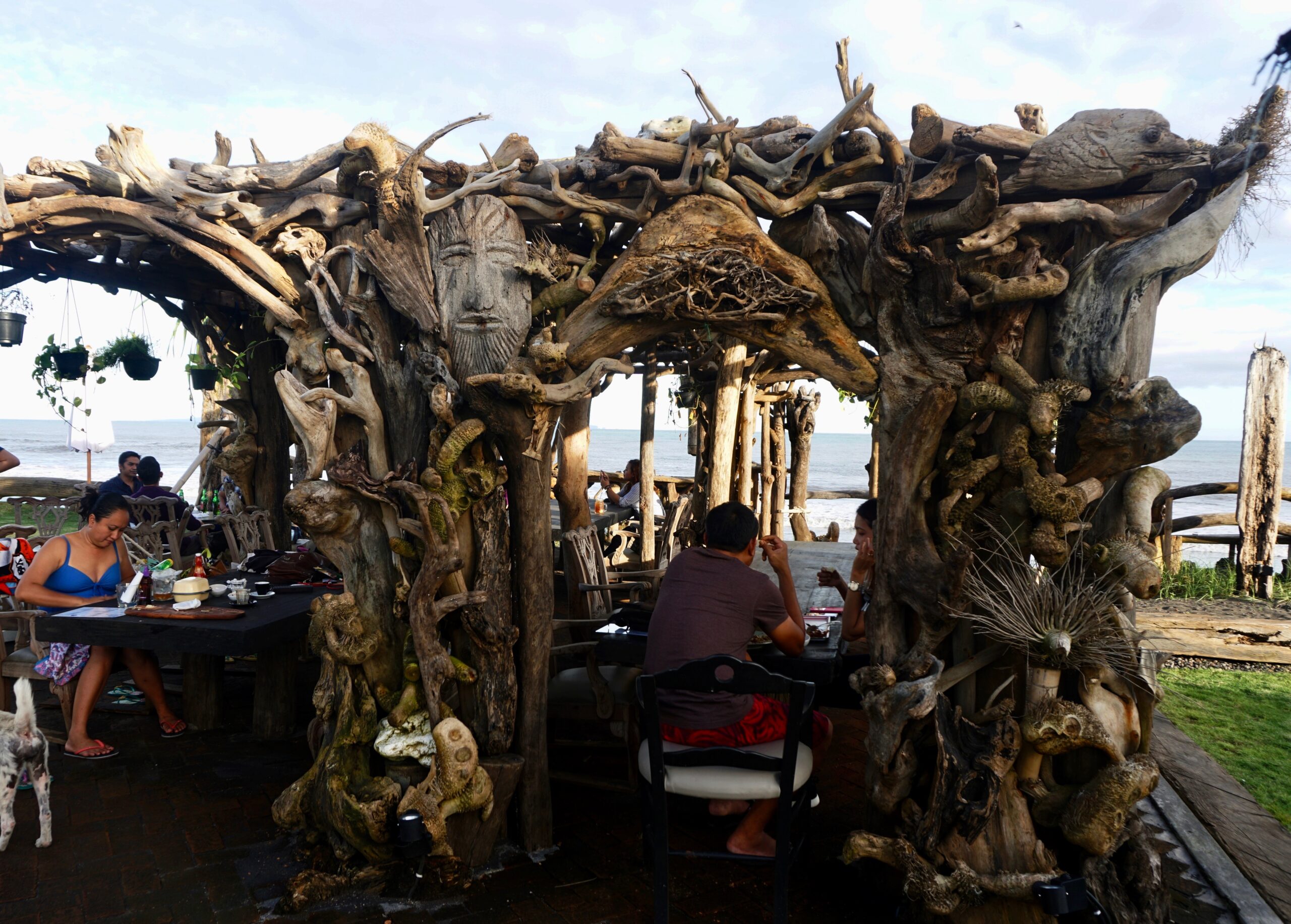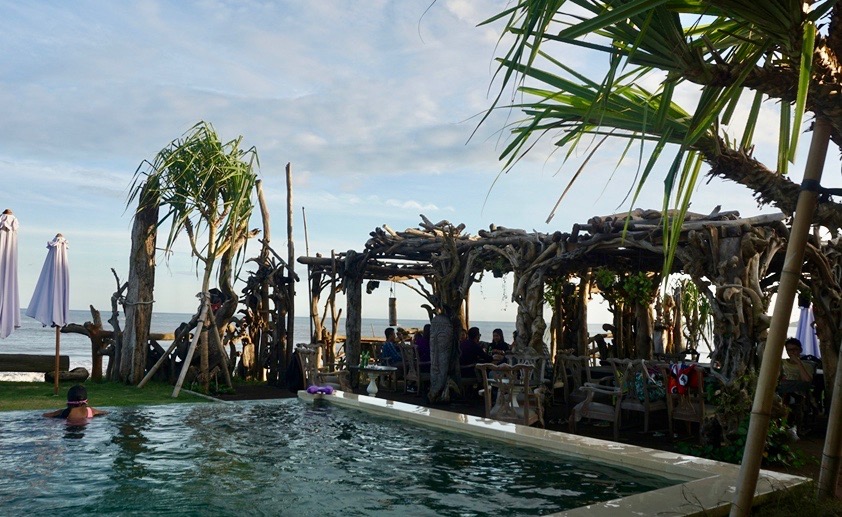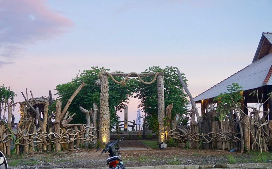 Sejumlah anak muda makan, minum, bercengkerama, dan selfie di bawah teduhnya rangkaian kayu-kayu sampah laut ini. Dengan sentuhan seni dan ketekunan, sampah kayu berubah citarasa menjadi ruang unik dan fungsional.