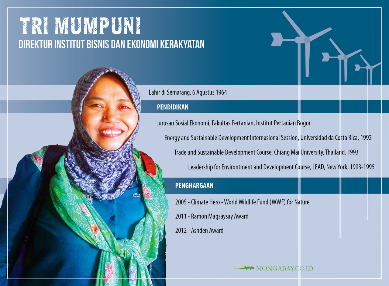 Namanya Tri Mumpuni Wiyatno. Perempuan kelahiran Semarang 53 tahun lalu ini tak kenal lelah mendatangi dan membangun energi terbarukan di desa-desa terpencil dan terluar di pelosok negeri ini. Bersama suaminya, Iskandar Budisaroso Kuntoadji, keduanya mendedikasikan hidup membangun kemandirian dan kesejahteraan masyarakat melalui energi terbarukan mikrohidro (turbin air) dan turbin angin.