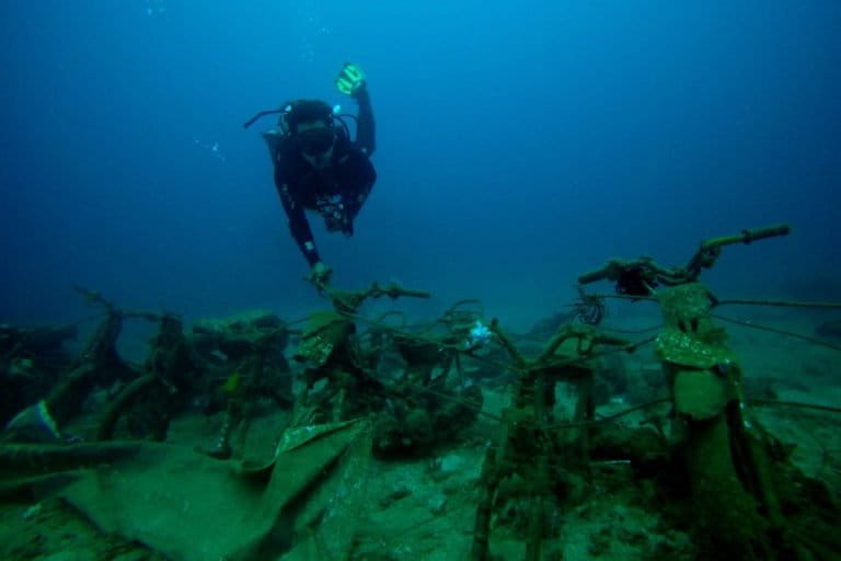 Sejenak menyelam, tampaklah sederetan motor yang ditenggelamkan. Uniknya motor-motor ini sengaja diikat semacam sling agar tidak lepas satu dengan lainnya. Di beberapa bagiannya telah ditumbuhi karang.