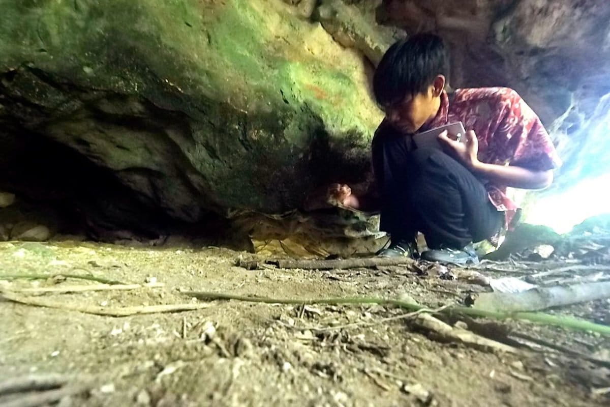 Ketua tim, Hari Suroto sibuk memperhatikan permukaan dinding gua. Lalu menuju permukaan tanah, dan menggalinya. Tampak pecahan kecil gerabah muncul, juga sejumlah serpihan tulang hewan.