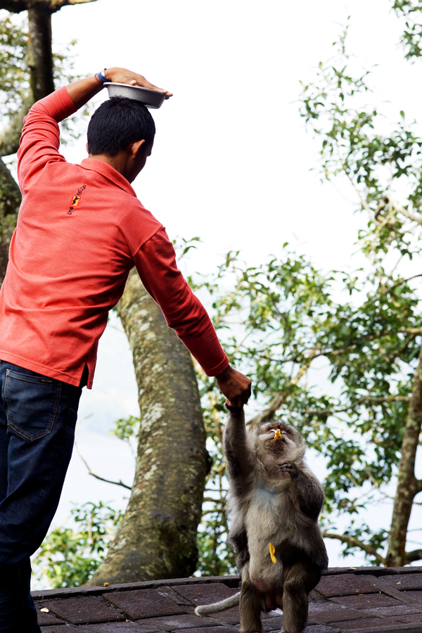 Sayangnya kegiatan memperhatikan tingkah laku si monyet yang lucu ini, dibarengi pula dengan kegiatan memberi makan kepada monyet-monyet itu. Ada sekitar 4-5 kelompok monyet tinggal di sini.