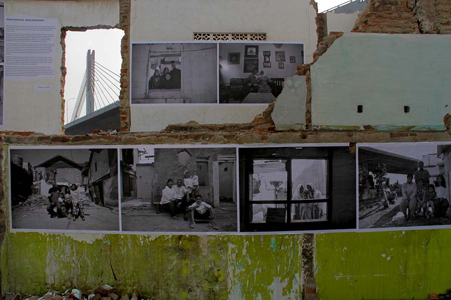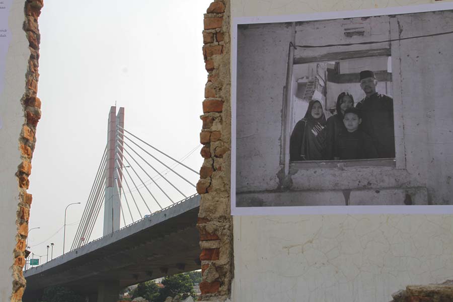 Hari makin sore. Lampu-lampu rumah mulai dinyalakan, tetapi hanya 16 rumah yang terlihat. Prabowo Setyadi, pemilik satu dari sejumlah rumah itu, sibuk memajang foto-foto keluarga pada tembok rumah tersisanya.