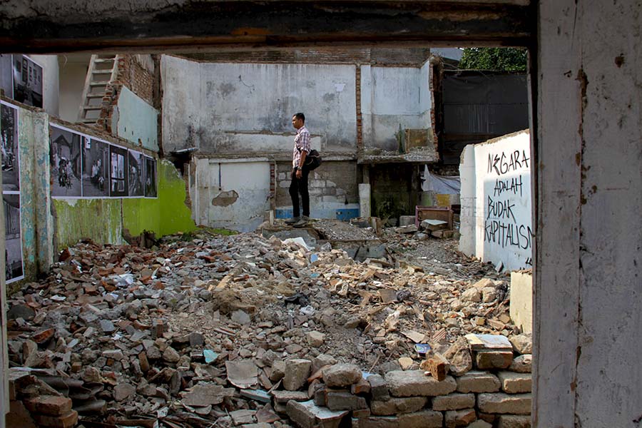 Dari balik tembok roboh terdengar suara polos seorang anak membacakan puisi karya Wijhi Tukhul. “Seumpama bunga, kami adalah bunga yang tak kau kehendaki tumbuh. Engkau lebih suka membangun rumah dan merampas tanah.”