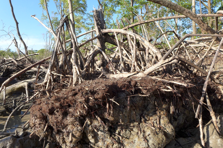 Salah satu bentuk adaptasi mangrove adalah kemampuannya dalam mengikat sedimen tanah (trapping sediment). Sistem perakaran mangrove yang kompleks dapat mengikat sedimen yang datang, baik sedimen dari hulu maupun yang terbawa air pasang. Sedimen ini lambat laun akan menambah tinggi elevasi permukaan tanah.