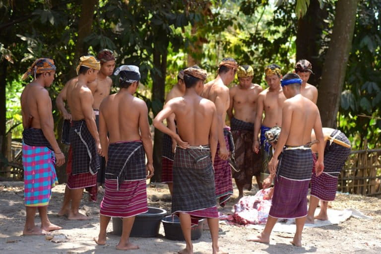 Sejumlah pria dewasa bertelanjang dada, mengenakan kain terlilit di pinggang hingga ke betis. Parang terselip pada ikatan sarung. Mereka berjalan beriringan, tanpa alas kaki, memasuki kompleks rumah tradisional Sasak di Karang Bajo, Kecamatan Bayan, Lombok Utara, Nusa Tenggara Barat.