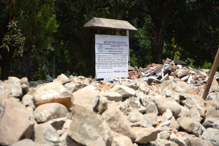 Sampai saat ini, bongkahan sisa bongkaran “bangunan baru” di kompleks Mesjid Kuno Bayan masih bertumpuk.