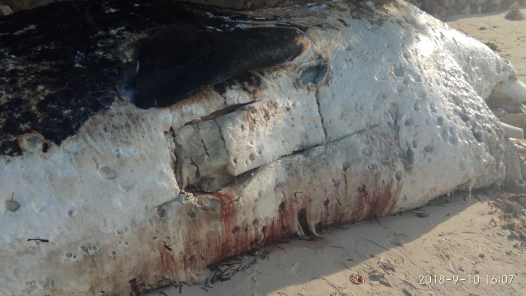 Juga terdapat luka sobekan di bagian bawah perut berbentuk U, diduga sobekan dari benda tajam. Sisi kanan tubuh paus menghitam, rangka bagian mulut bawah sudah patah dan badan sudah membusuk (kode 4)
