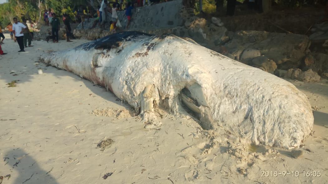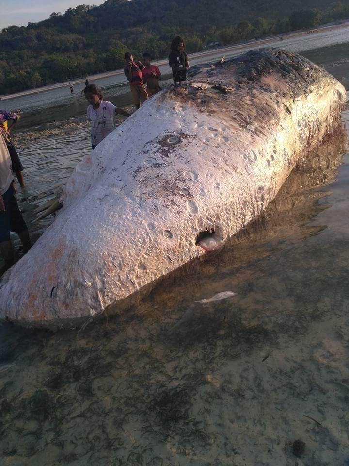 Setelah didekati nelayan, penampakan putih besar itu ternyata adalah seekor paus sperma (Physeter macrocephalus) yang telah mati mengambang dengan kondisi kode 4 dan sudah berbau.