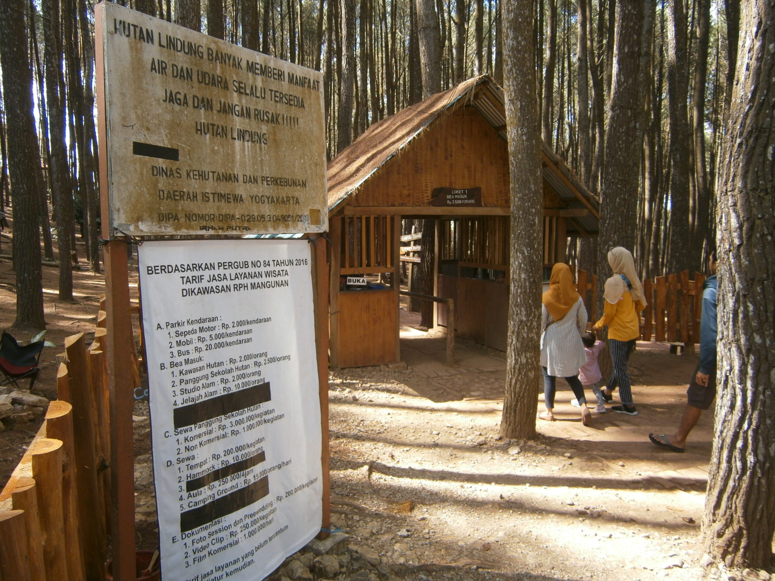 Matahari belum terlalu tinggi. Serombongan pesepeda yang berolah raga pagi melewati turunan curam dekat Kantor Resort Pemangkuan Hutan (RPH) Mangunan. Tak jauh, kantong parkir di area Pinus Sari terletak di Desa Mangunan, Kecamatan Dlingo, Bantul, Yogyakarta, tampak terisi puluhan sepeda motor, beberapa mobil serta bus dari luar kota.