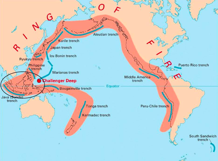 Namun demikian, negeri ini juga merupakan salah satu negara yang paling rawan gempa, karena berada pada pertemuan lempeng bumi hampir di sekelilingnya disertai dengan jalur aktif gunung berapi [2]. Kombinasi lempeng bumi yang selalu bergerak dan gunung merapi yang aktif suatu waktu dapat memicu gempa, baik gempa skala kecil sampai sangat besar (megatrust). Gempa besar adakalanya memicu tsunami. Sehingga Indonesia merupakan bagian dari Pacific Ring of Fire (Cincin Api Pasifik) [3] (Gambar 1), yang merupakan daerah gempa teraktif di dunia.