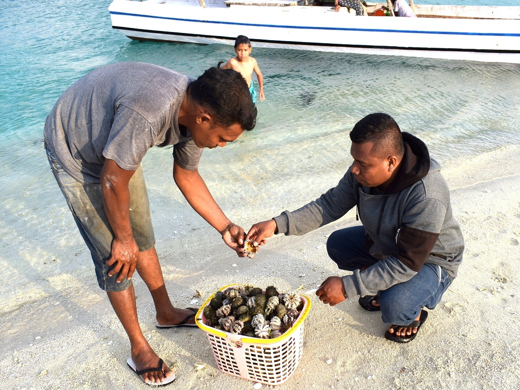 Fauzan warga Lewoleba lainnya terlihat membawa seember penuh bulu babi atau landak laut. Landak laut ini (Diadema setosum) banyak terdapat di pulau Siput dan terlihat di pesisir dengan airnya yang jernih.