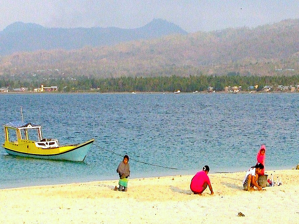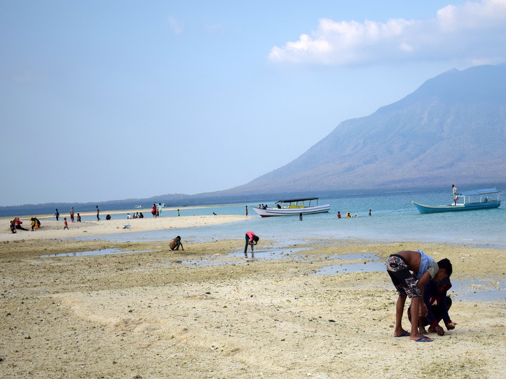 Hari itu, terdapat 30 perempuan dan anak-anak sedang asyik menggali pasir putih di pulau ini. Ember plastik diletakkan di sampingnya untuk menampung siput-siput kecil berukuran ibu jari orang dewasa.