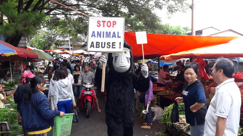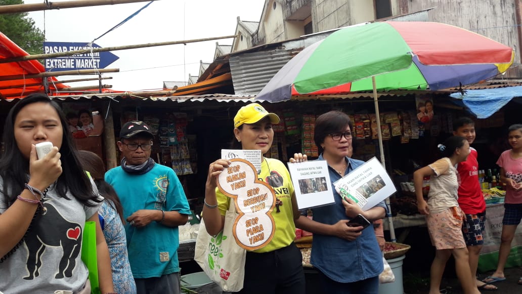 Jelang Natal dan Tahun Baru, sejumlah aktivis konservasi menggelar kampanye di pasar Tomohon, Sabtu (22/12/2018). Di sana, mereka membagi informasi tentang penyelamatan satwa dan bahaya konsumsi daging satwa liar, hewan domestikasi, serta status perlindungan satwa jenis tertentu.