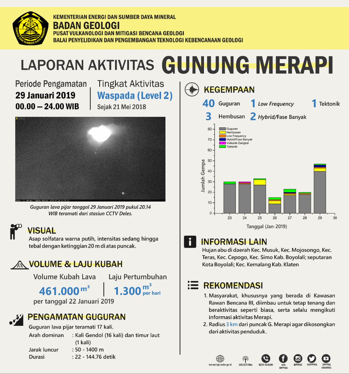 Balai Penyelidikan dan Pengembangan Teknologi Kebencanaan Geologi (BPPTKG) Yogyakarta, mencatat Gunung Merapi mengeluarkan setidaknya enam kali guguran meluncur dari puncak Rabu pagi, (30/1/19). Sehari sebelumnya, Selasa malam, Merapi mengeluarkan guguran awan panas. Status Merapi tetap waspada dengan melarang aktivitas radius tiga kilometer dari Puncak Merapi.