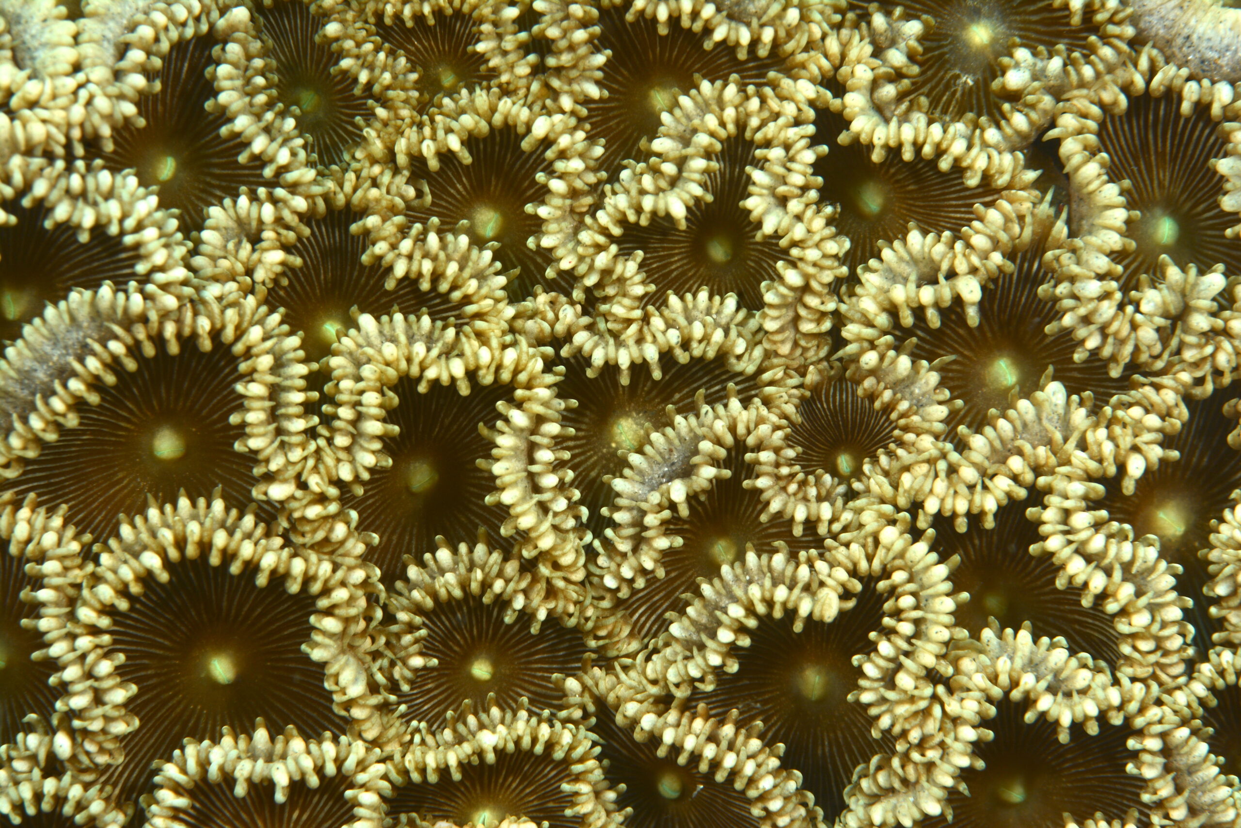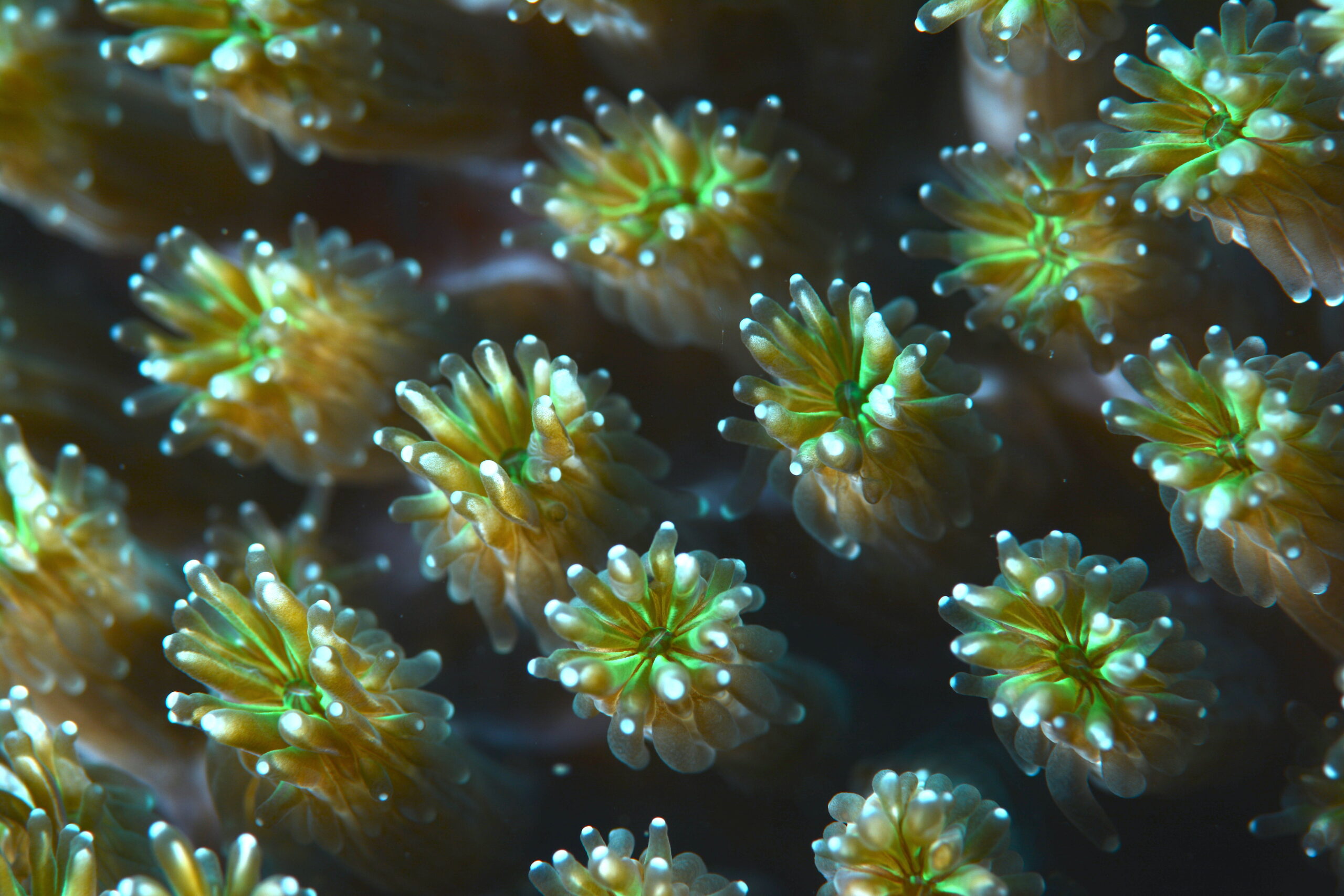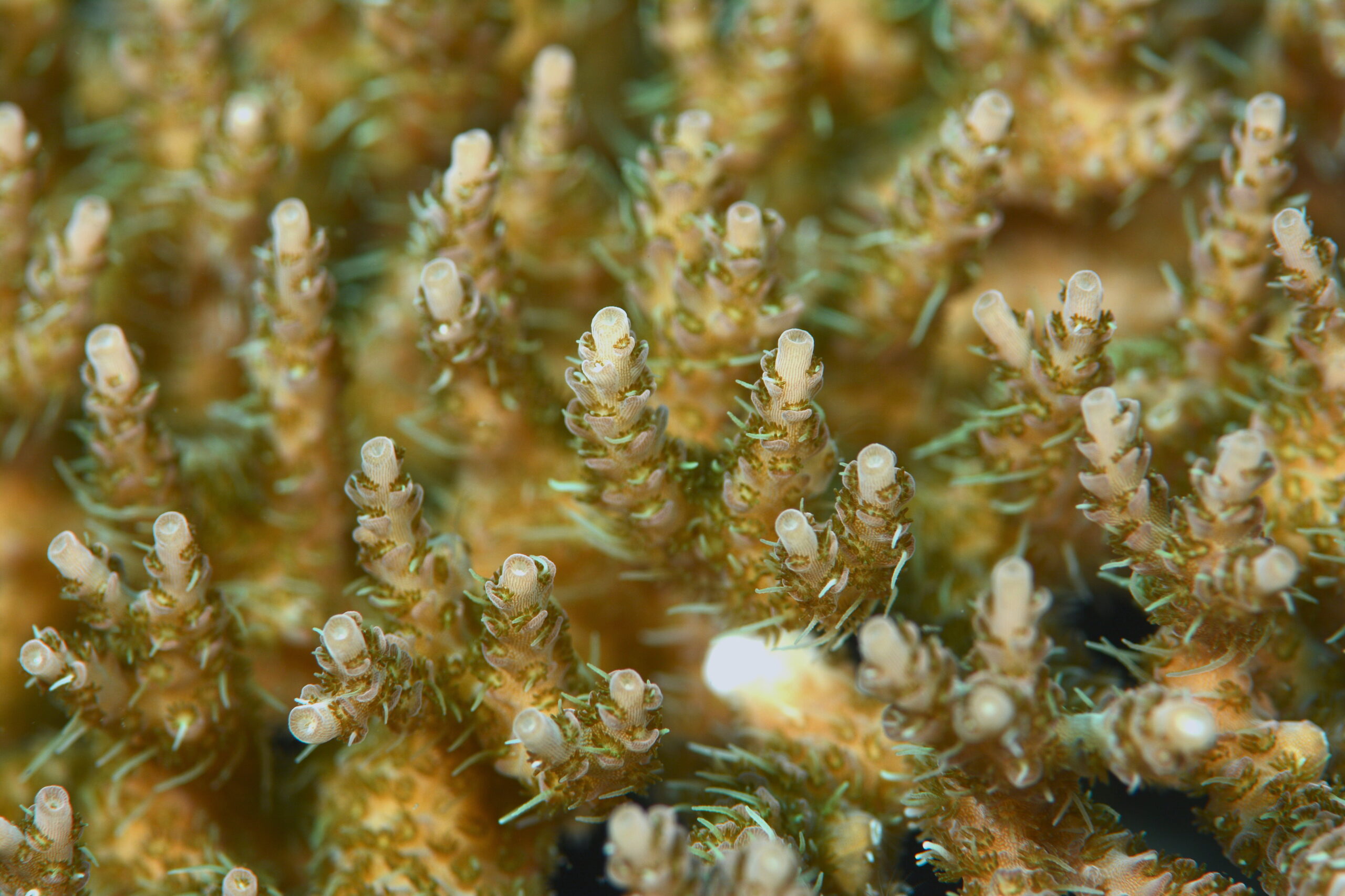Foto pertama menunjukkan momen keluarnya tentakel dari 1 polip karang. Munculnya tentakel karena aktifitas produksi atau mencari makan, yang biasanya terjadi pada malam hari. “Tapi, karena ini ada di daerah yang bisa membuat mereka berproduksi atau mencari makan, makanya keluar lah tentakel-tentakel ini. Dia juga muncul karena karang tidak dalam keadaan stres, bertumbuh baik, tidak terganggu dan bertumbuh sehat,” ujar Biondi.