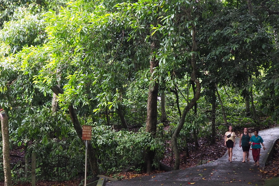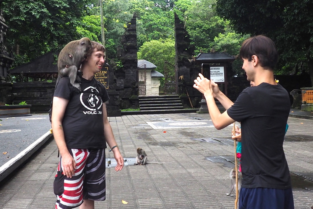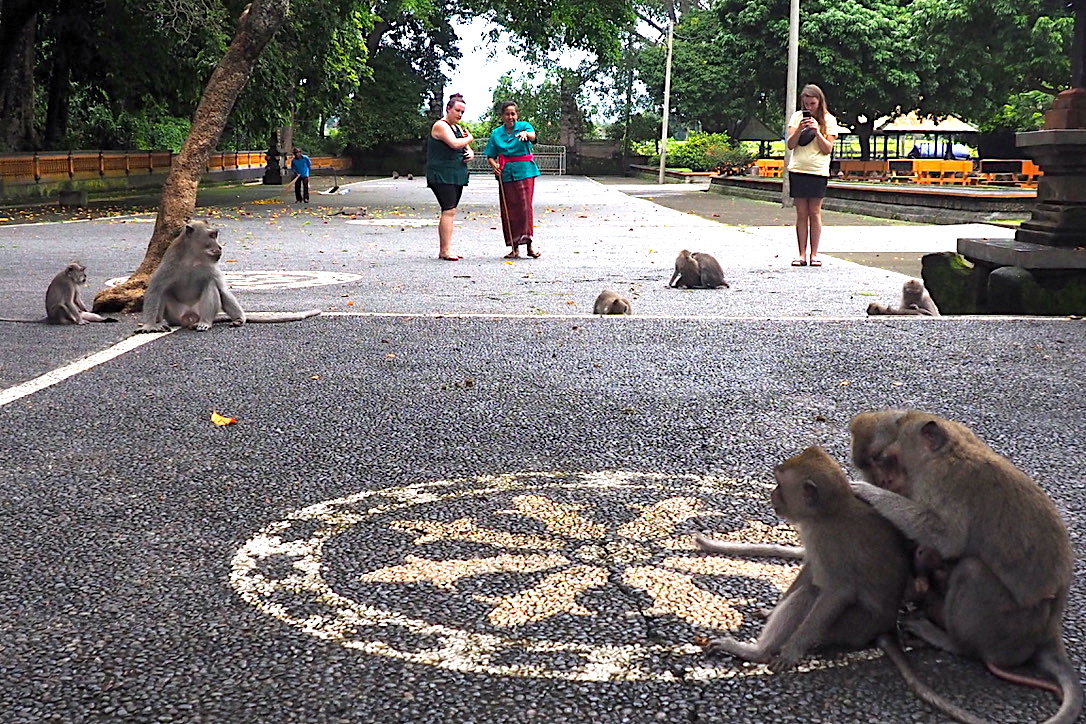 Sepanjang jalan itu, para monyet sudah menyambut pengunjung. Sejak dari loket masuk, monyet-monyet sudah berkeliaran di jalan. Beberapa di antaranya berebut makanan. Ada pula yang asyik mencari kutu di bulu-bulu anaknya. Pada umumnya mereka bersikap jinak kecuali jika pengunjung membawa makanan.