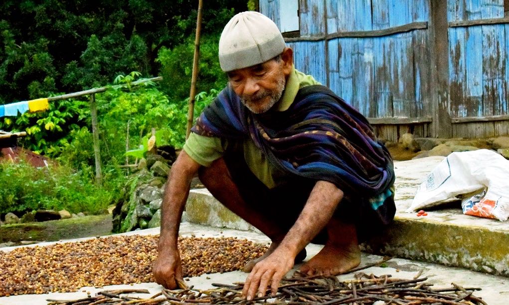 Blasius Paka, lelaki tua itu menggunakan tenun ikat tradisional. Dia sibuk mengeluarkan biji kopi dari wadahnya. Kopi itu ia jemur di bawah terik matahari pagi yang hangat.