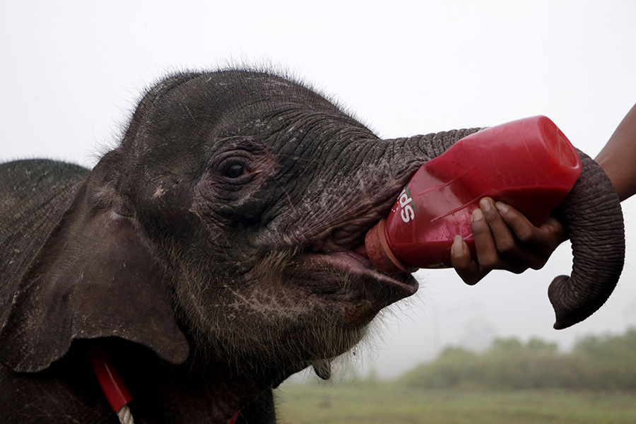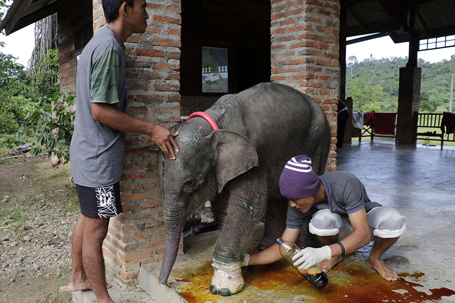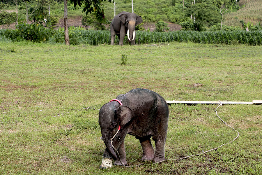 - Gajah betina usia satu tahun ini, kaki kiri depannya nyaris putus akibat jerat yang dipasang pemburu