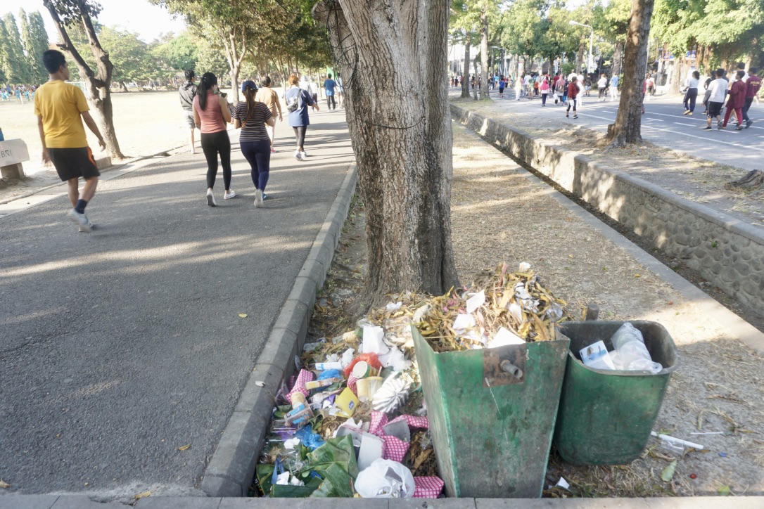 Got yang berdampingan dengan trotoar yang menjadi tempat makan juga kena imbas. Ada puluhan sisa kemasan seperti gelas plastik, mika, styrofoam, pipet, dan kresek dibuang sembarangan ke saluran air ini. Tong-tong sampah di sejumlah sudut lapangan nampak penuh, bahkan meluber ke taman.