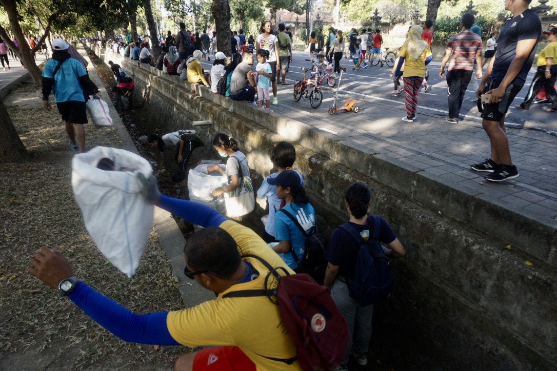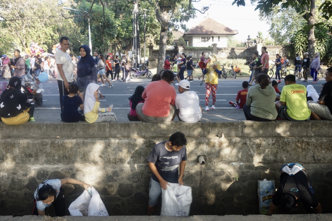 Ada pemandangan kontras pada CFD hari Minggu itu. Ada belasan peserta Pawai Bebas Plastik yang sukarela memunguti sampah plastik di Lapangan Renon, salah satunya got itu. Kehadiran mereka seolah menyentil perilaku nyampah dan masih masifnya distribusi serta penggunaan PSP di Bali.