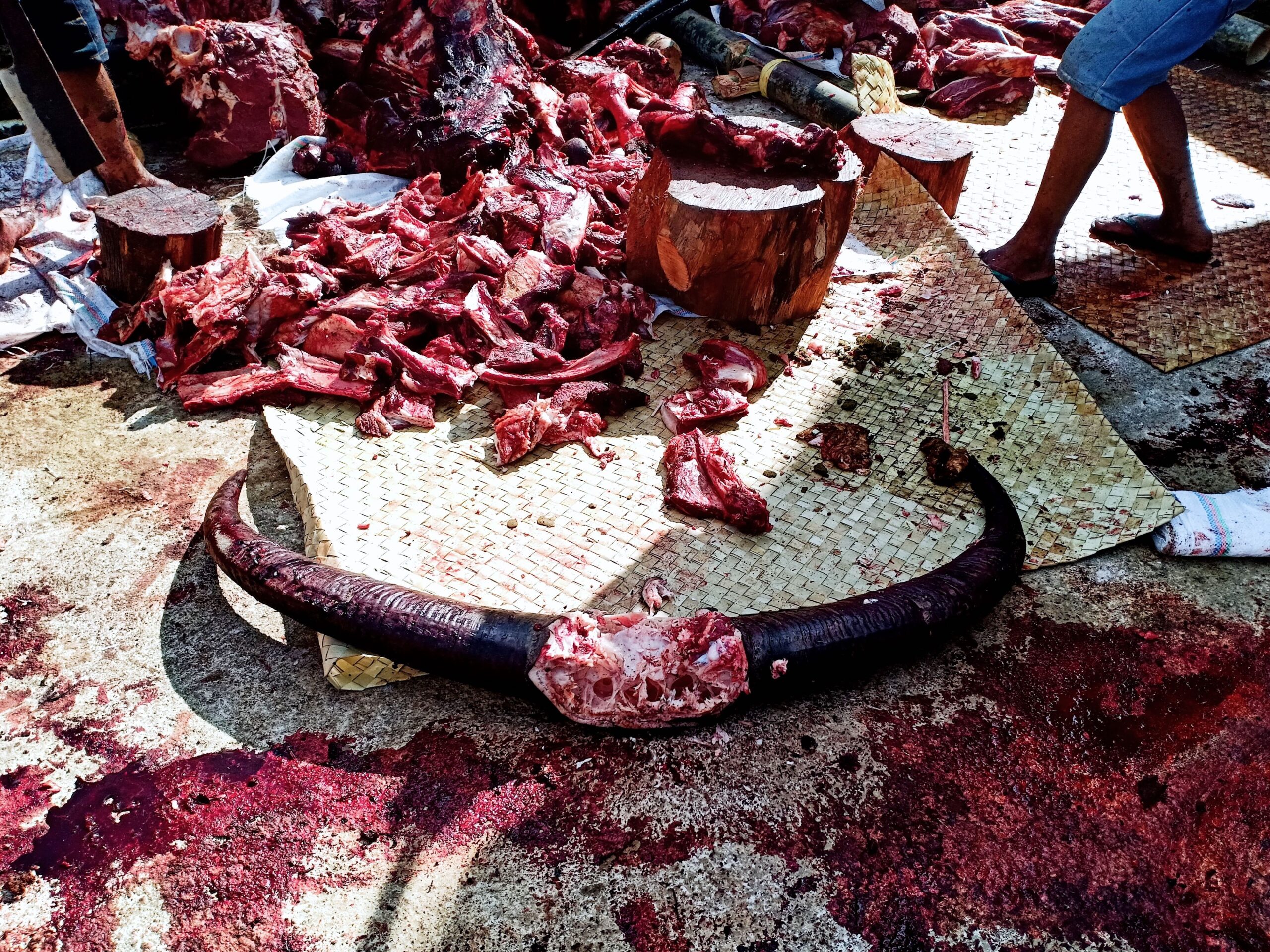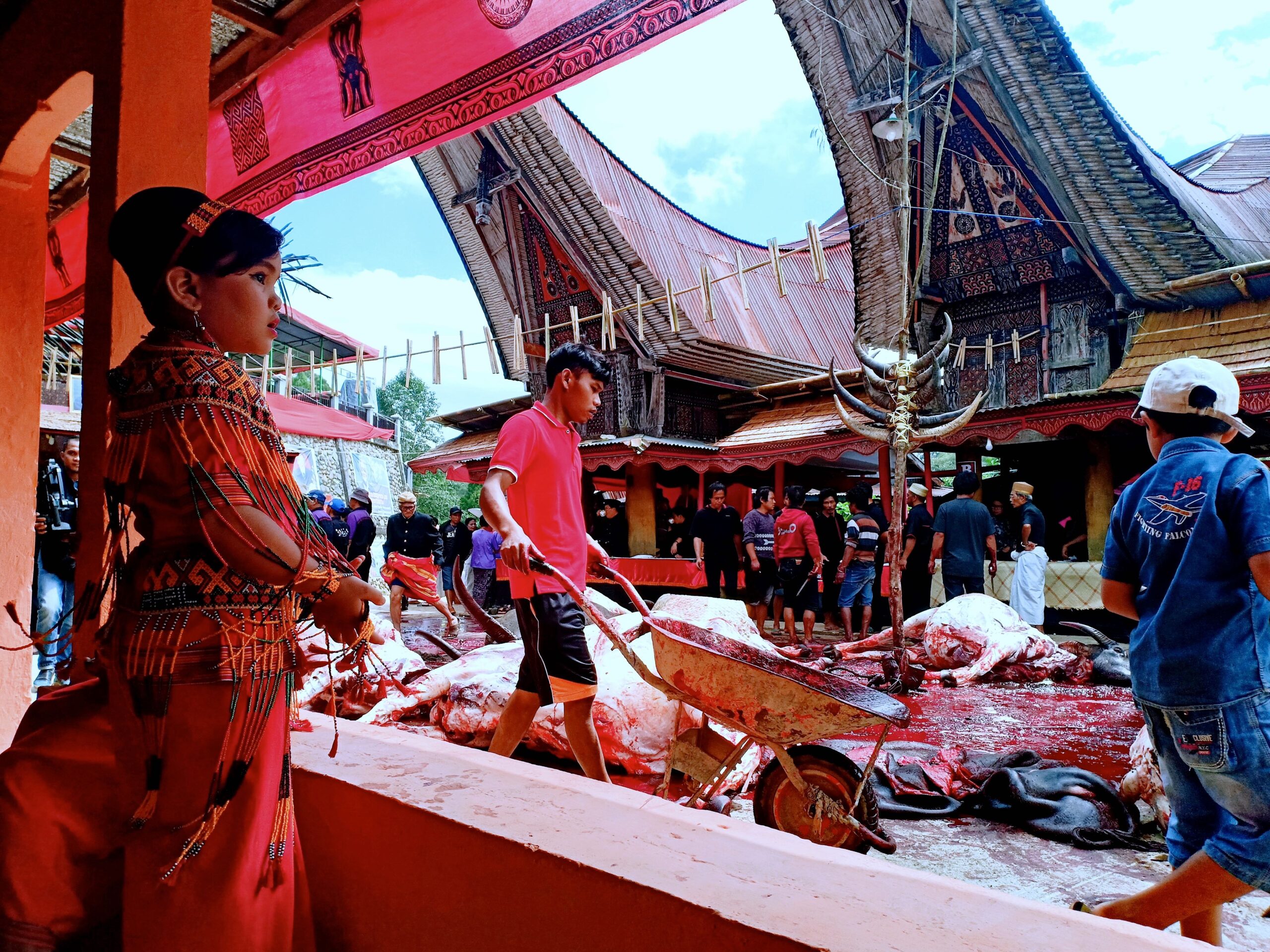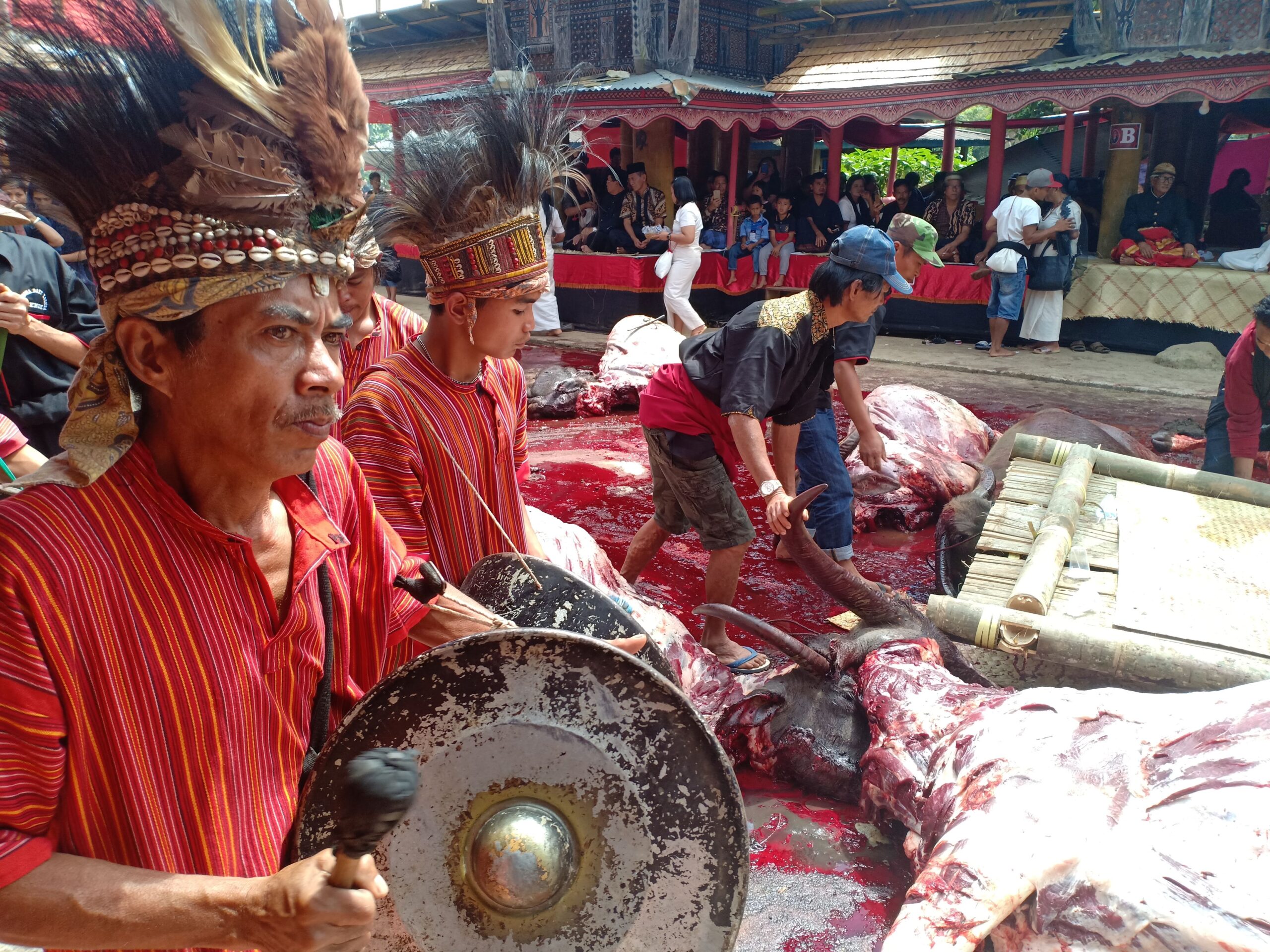 Darah membanjiri pekarangan kompleks Tongkonan Ratte Pa’tondon. Pada pukul 11 siang, sepuluh ekor kerbau sudah tergeletak di tanah. Dalam adat Toraja pemotongan kerbau (tedong) adalah salah satu hal yang identik dengan upacara Rambu Solo’.