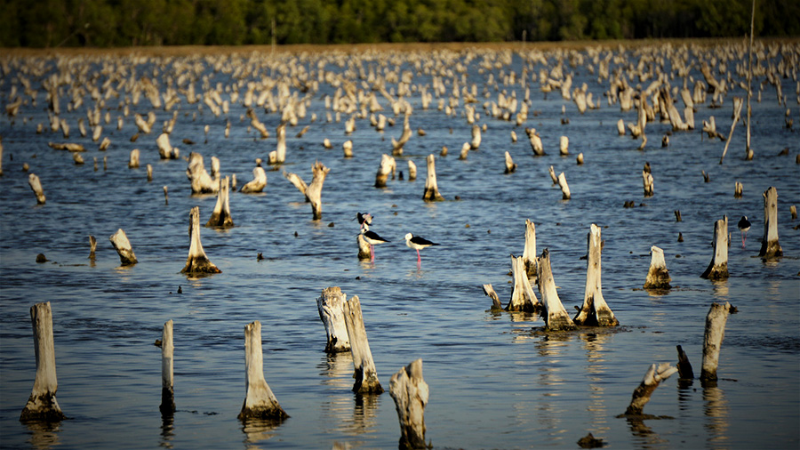 Saat Jamal bercerita tambaknya, sesekali burung hinggap di sisa pohon mangrove. Sementara Hanom Bashari, Tatang Abdulah, Ririn Hasan dan lainnya menelusuri pematang, mengamati sudut-sudut tambak.