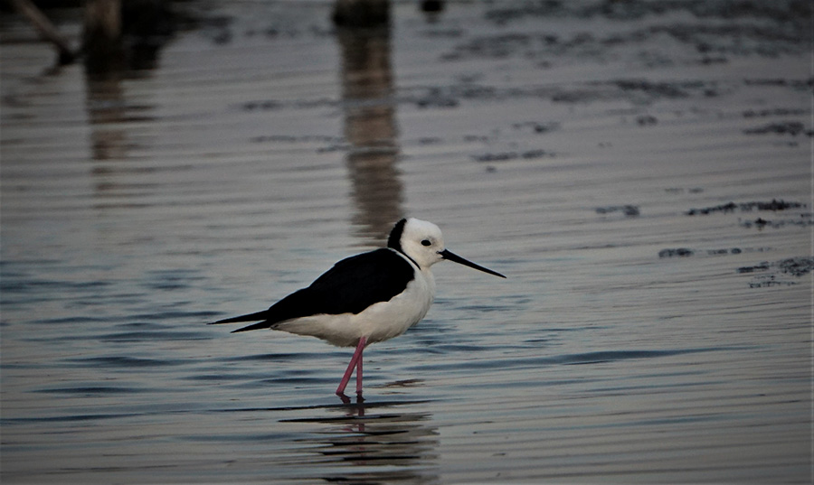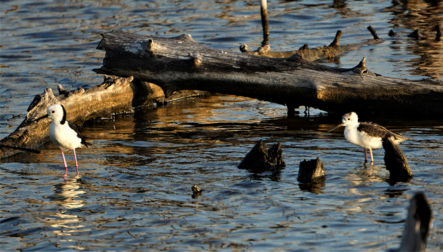 Burung Black Winged Stilt atau gagang bayam belang [Himantopus himantopus] datang menyambut. Suara si kaki jangkung ini mudah dikenali, cukup berisik. Biasanya, mencari makan berkelompok, tapi ada juga yang sendiri. Tampak pula gajahan penggala [Numenius phaeopus], juga seekor burung trinil pantai [Actitis hypoleucos] yang sibuk menyantap pakan.