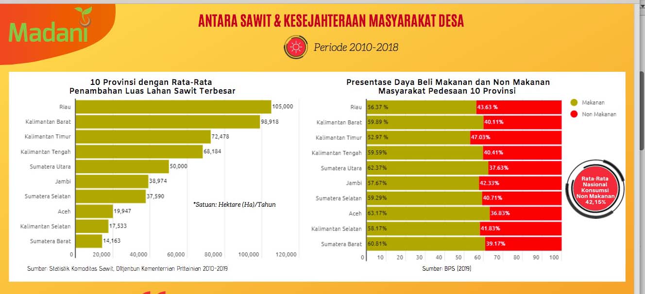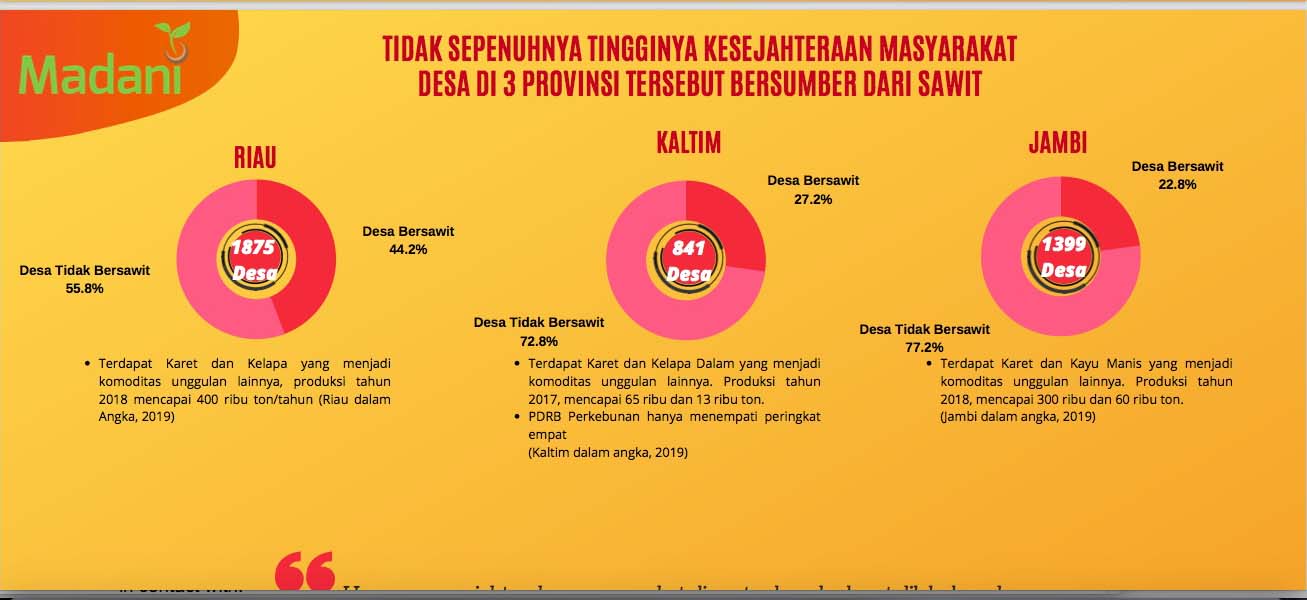 Hasil analisis Yayasan Madani, upaya menyejahterakan masyarakat di daerah bisa fokus menyeimbangkan antar jenis komoditas. Contoh, di Jambi dan Riau, disebutkan memiliki kesejahteraan dari rata-rata nasional, namun masing hasing memiliki desa yang tak bersawit lebih besar, masing masing 77,2% (Jambi) dan 55,8% (Riau).