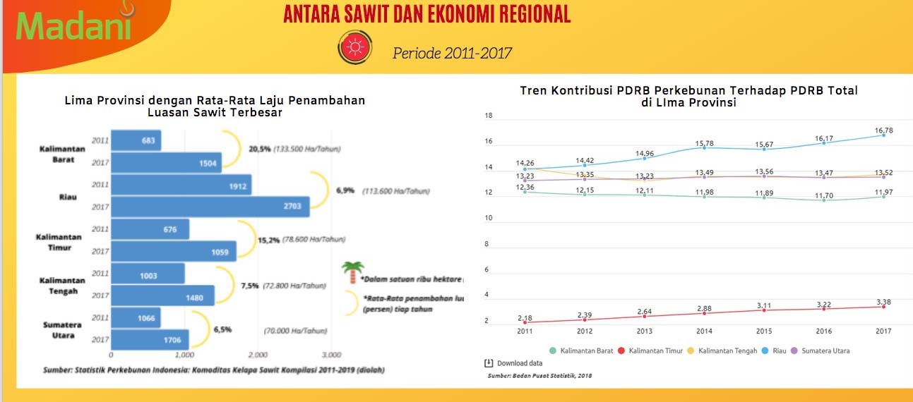 Pemerintah Indonesia kerap mengatakan, industri sawit merupakan andalan pemasukan negara dan sektor prioritas. Apakah kehadiran industri sawit di satu daerah mampu mesejahterakan masyarakat hingga tingkat tapak atau hanya segelintir orang? Penelitian Yayasan Madani, Maret lalu mencoba menjawab isu ini. Madami menyandingkan data produk domestik regional bruto (PDRB) di wilayah yang memiliki luasan sawit terluas di Indonesia. Hasilnya?