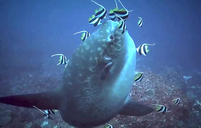 Seekor Mola-mola terlihat seperti berdiri dengan mata terpejam. Ia nampak menikmati cubitan puluhan ikan kecil banner fish dan ikan lain di bagian mata sampai bagian tengah tubuhnya. Kegiatan pembersihan parasit di tubuhnya ini kerap disebut spa, dan terjadi di sejumlah titik cleaning station kawasan perairan Nusa Penida.