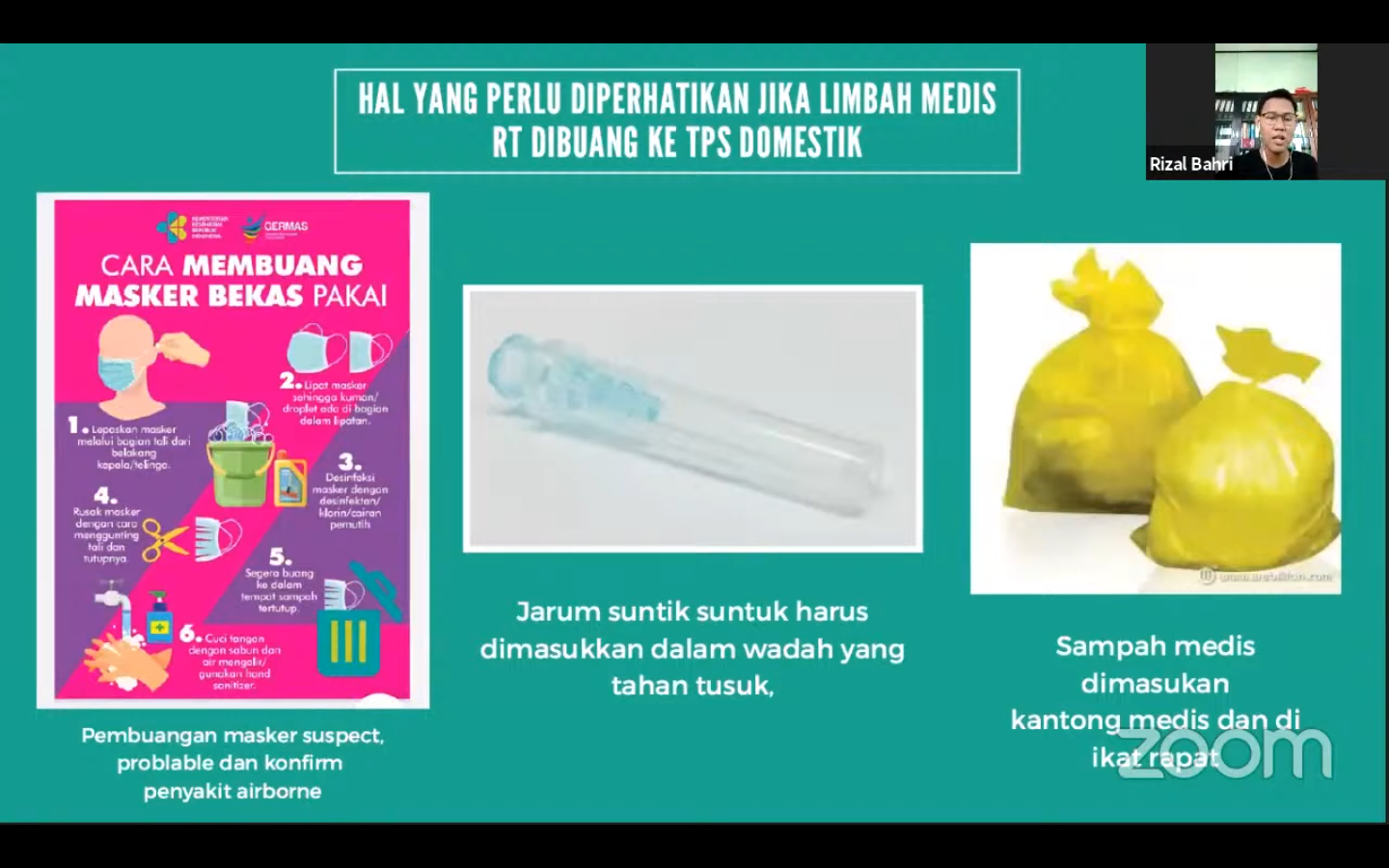 Rizal memberi tips, untuk pengurangan limbah medis di rumah, memperhatikan guna ulang seperti menggunakan masker kain 3 lapis, sanitasi, cek durasi waktu penggunaan, dan cara penggunaannya. Kecuali sedang terinfeksi.